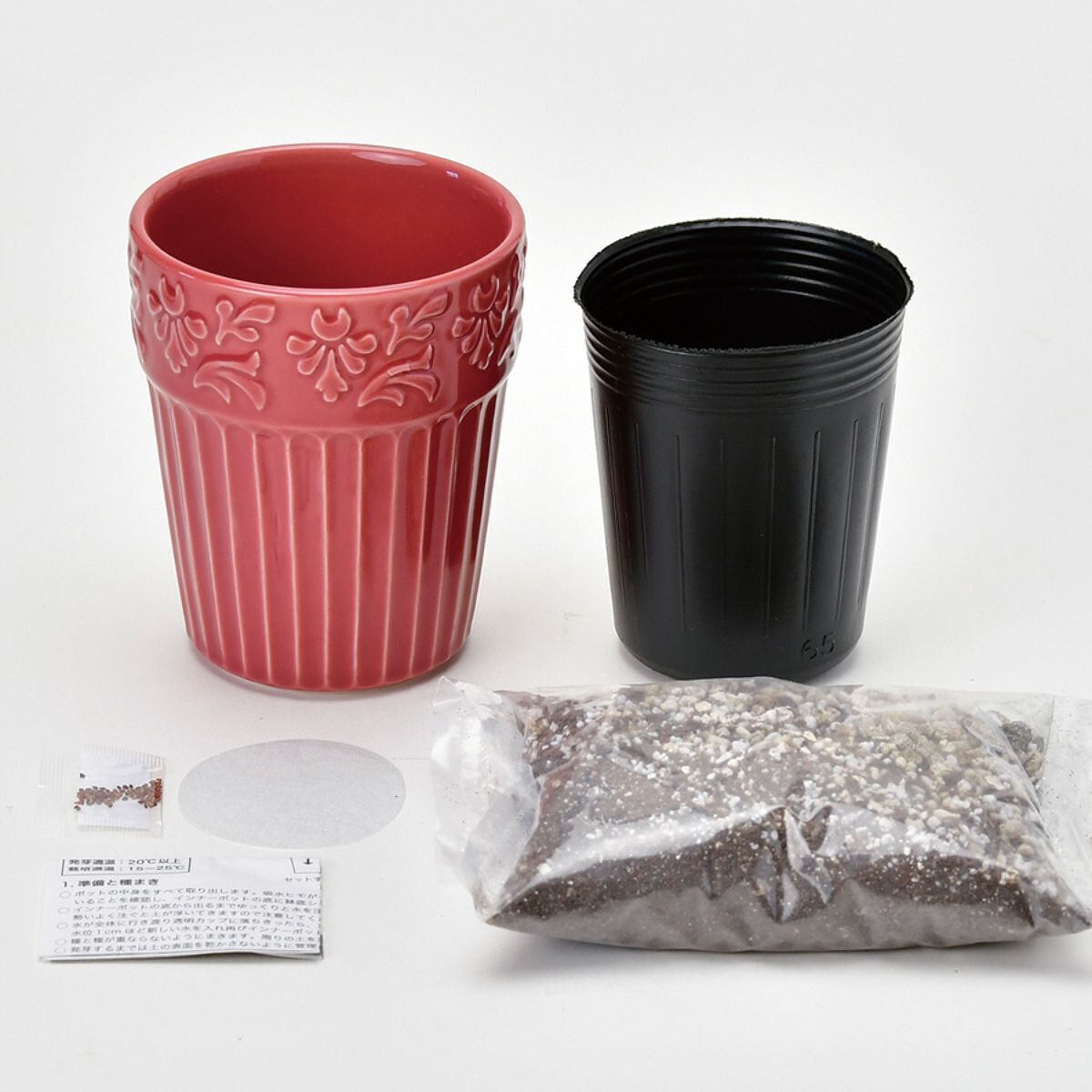 サイズ : 約 Φ80 x H95 mm セット内容 : 陶器ポット, インナーポット, 鉢底シート, 培養土, 種, 説明書