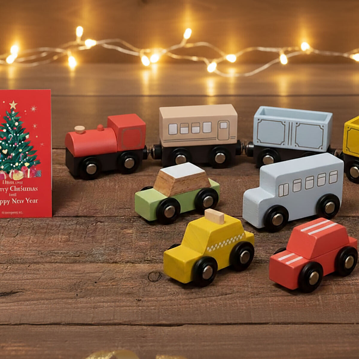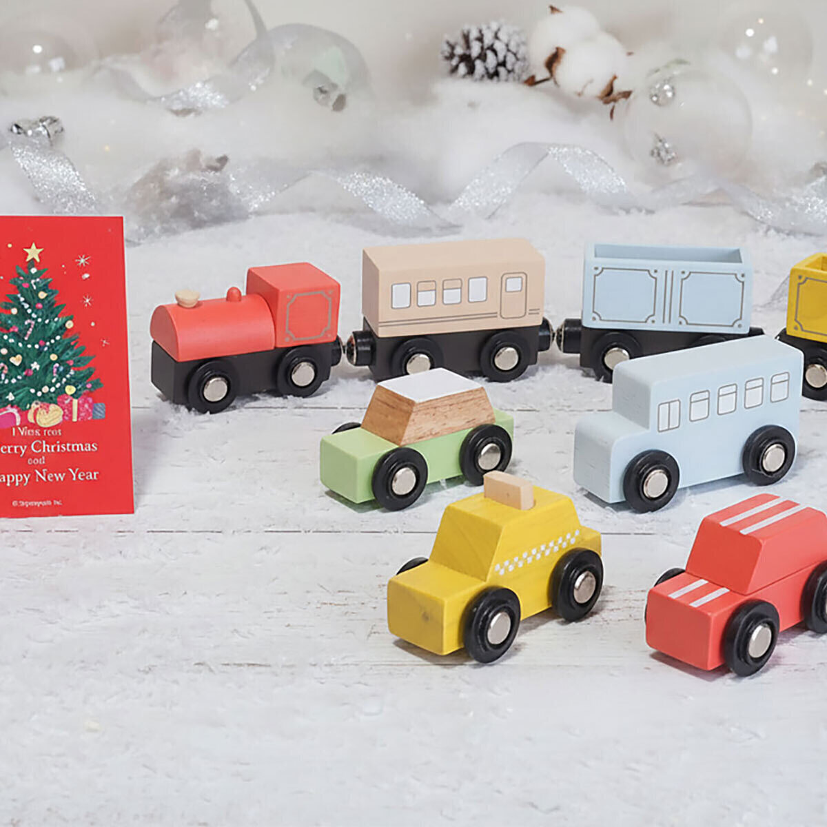 電車好きにもクルマ好きにも喜ばれるおもちゃです。色とりどりの乗り物が、磁石で「ピタッ!」とくっつく不思議な感覚にワクワク♪