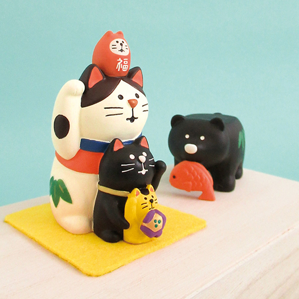 右手で金運、左手で人を、子猫もだるまもこぞって総出で賑やかに福を招きます。