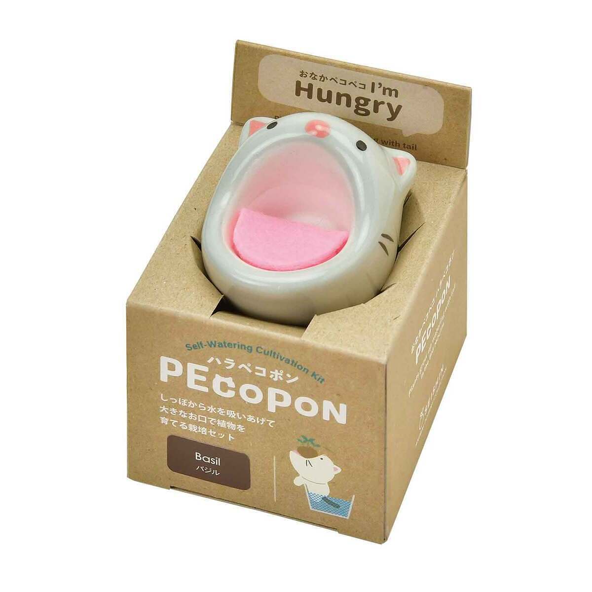 いつもお腹ペコペコの子ネコ「ハラペコポン」は、とても食いしん坊。特技はしっぽから水を吸い上げて大きなお口で植物を育てることです。今日も大好きな植物をお口いっぱいに頬張って、大満足。