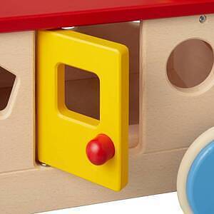 バス本体の前面や車輪にはゴム製のガードが付いていて、フローリングの床や壁に当たった時の衝撃吸収や音の軽減にも配慮されています。メイドインジャパンの、しっかりと丁寧に作られた木製玩具です。木製玩具としてのシンプルなシルエット、白木とカラフルなパーツの組み合わせは、お部屋のインテリアにも自然とマッチします。