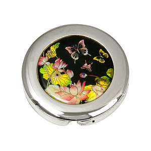 サイズ : 約Φ45 x 10 mm (本体のみ折りたたみ時) 重量 : 約100g 耐荷重 : 約5kg 材質 : 貝殻, PVCコーティング, ミラー, 亜鉛合金, マグネット, ゴム