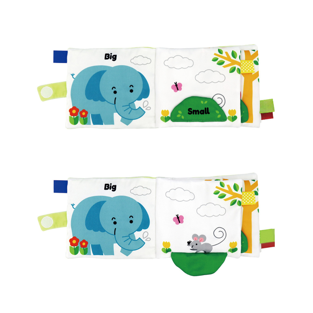 ページをめくるたびに、「大きい」ゾウさんと「小さい」ネズミさんなどが登場し、大きい・小さい、上・下などの違いをかわいい 動物イラストと英単語で表現しています。