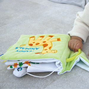 「幼児教室」生まれの布のおもちゃはファーストトイにぴったり!カラフルなリボンタグ、触るとシャカシャカ音がする表紙、草むらに隠れている動物など、赤ちゃんの興味を引く仕掛けがたくさん!