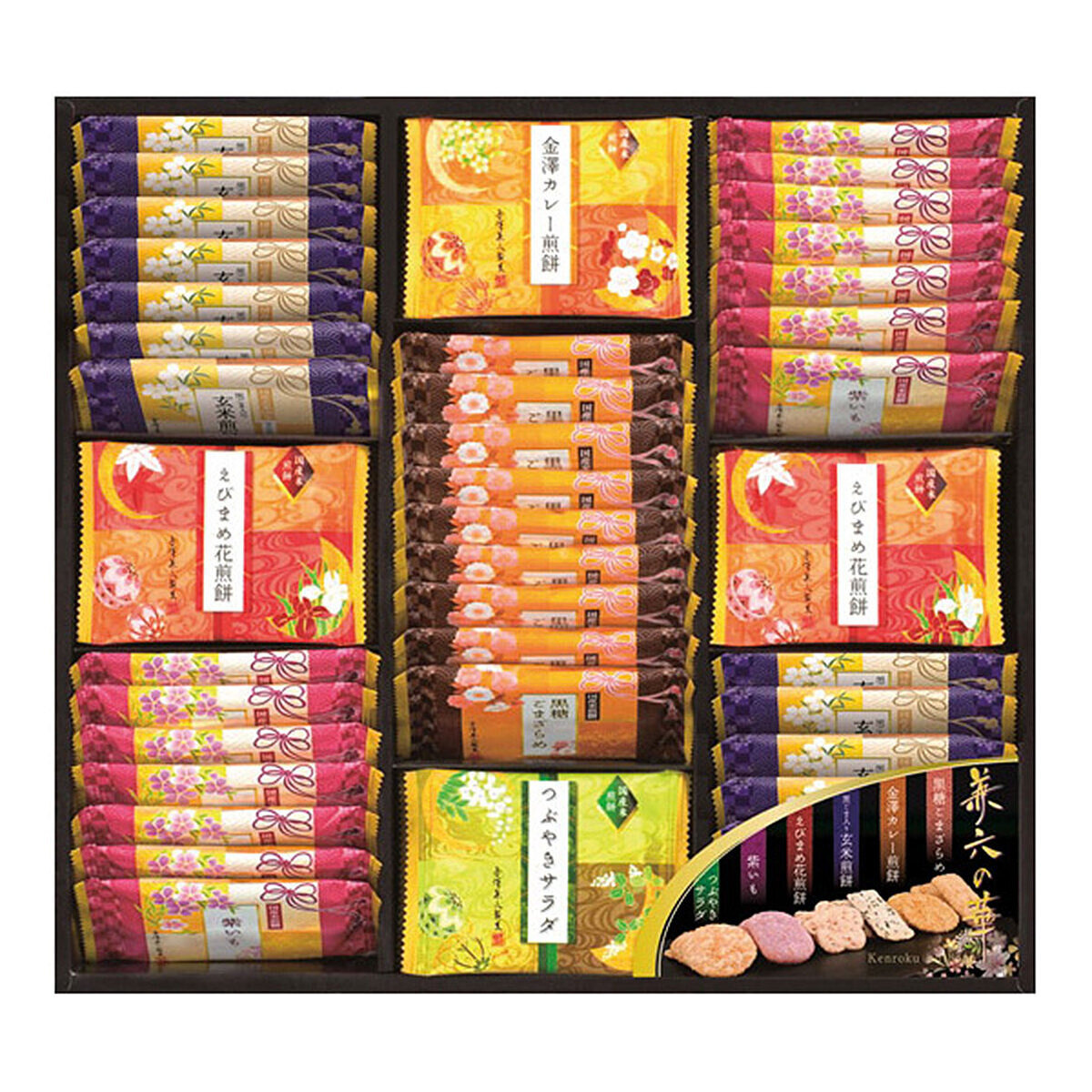 商品 : 黒ごま入り玄米煎餅・紫いも 各14, えびまめ花煎餅 x 12, 黒糖ごまざらめ x 9, 金澤カレー煎餅・つぶやきサラダ 各6 加工地 : 日本 (米/国内産)【小麦・乳・エビ】 ボックス : 約 372 x 338 x 57 mm