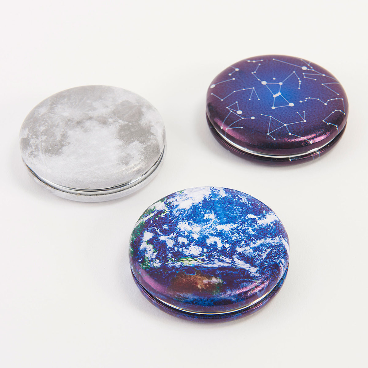 手のひらに浮かぶ美しい宇宙。リアリティのある柄が魅力的な、デザイン性の高い大人のためのミラーです。地球と月、そしてオリオン座などの冬の星座を表現したミラーは、手のひらにすっぽりと収まるサイズなのでポケットやポーチなど携帯にとても便利な上、平面鏡と拡大鏡 (2倍) の2面付きで機能性も申し分ありません。