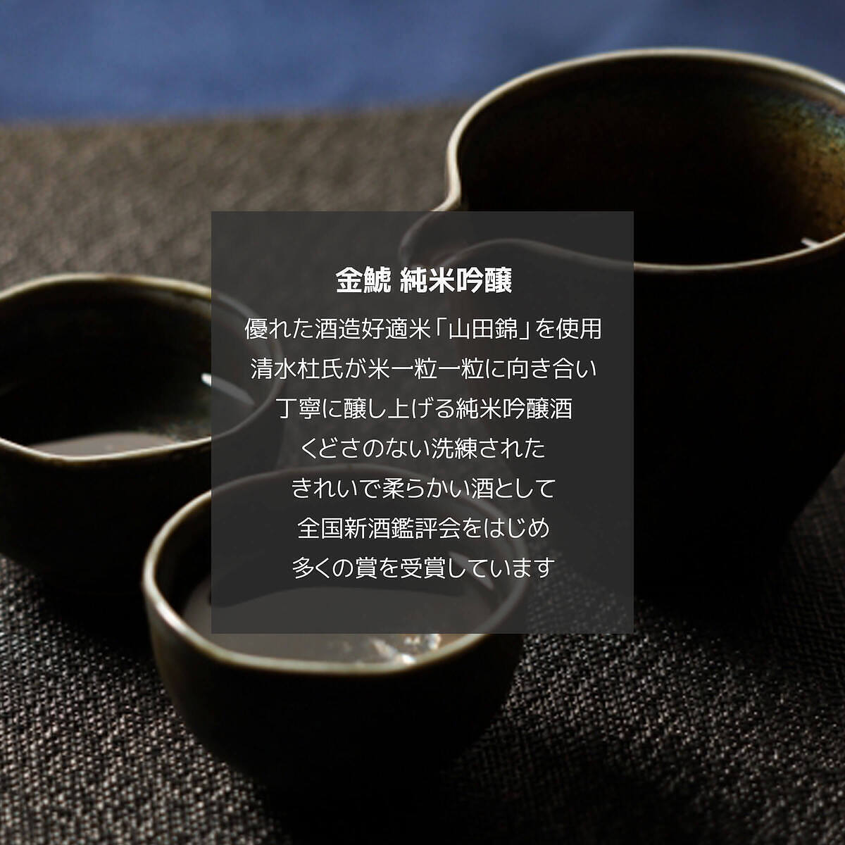 酒米の横綱格といわれる山田錦と知多半島の伏流水を使い、清水杜氏が酒造りに真摯に向き合って手間と真心を込めて醸した純米吟醸酒「金鯱」。くどさのない洗練された柔らかい酒として、全国新酒鑑評会をはじめ多くの賞を受賞しています。米の旨味と穏やかな香りが特徴で、掛け米、こうじ米ともに山田錦だけを使ったふくらみのある味わいは、様々な料理に合わせてお楽しみいただけます。燗から常温では米の旨味を、冷酒ではすっきりとしたキレを楽しめる、温度によってさまざまな表情をみせる酒です。小さな蔵だからこそできる、手間ひまかけた手作りの味をぜひご堪能ください。