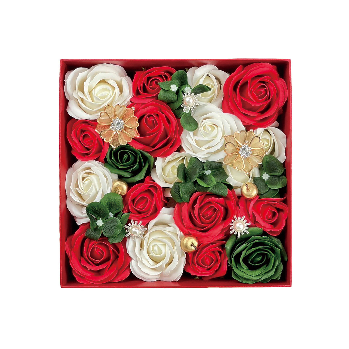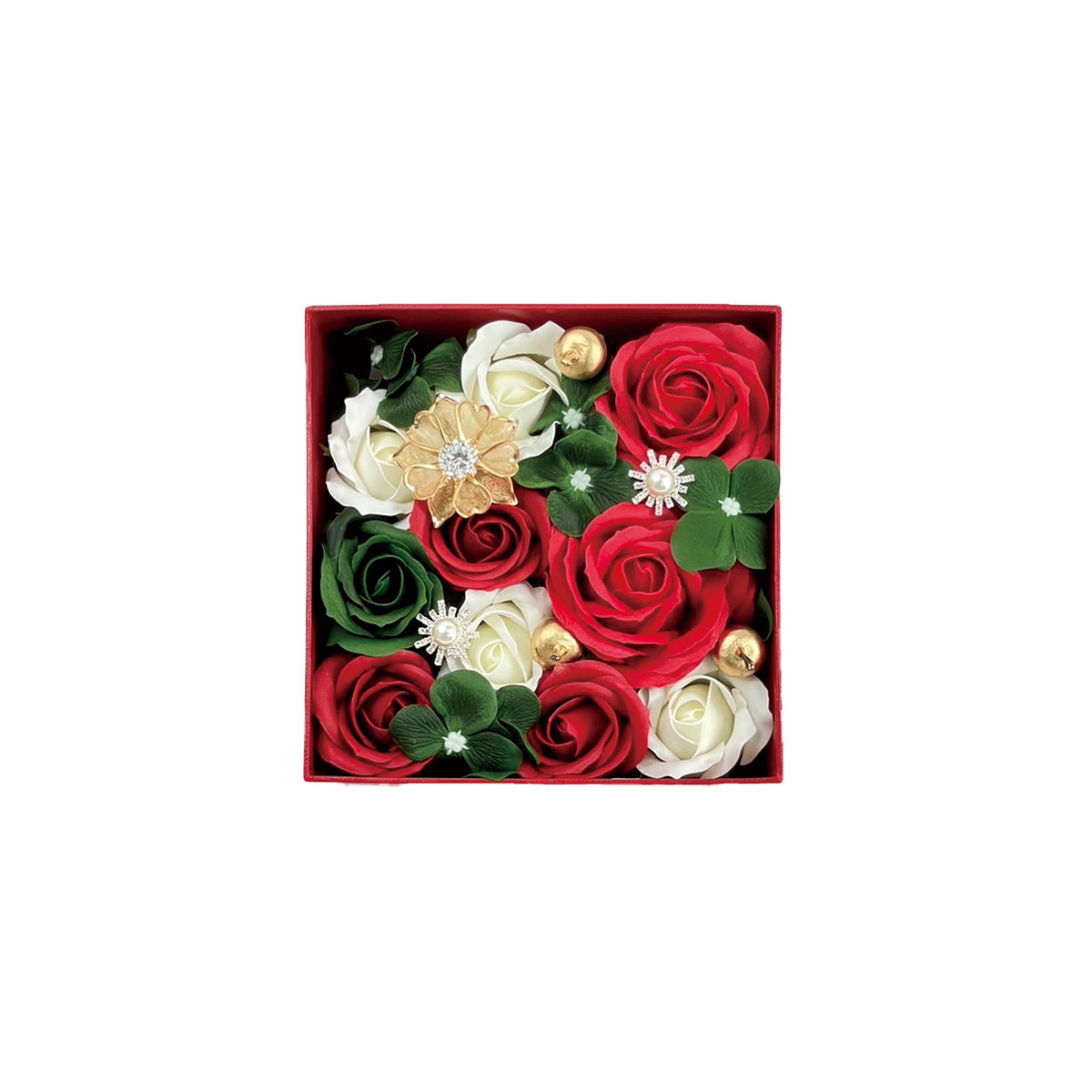 高級感あふれる赤いボックスにお花を贅沢に並べた美しいボックスアレンジ。 ゴールドのパーツが上品に輝きます。