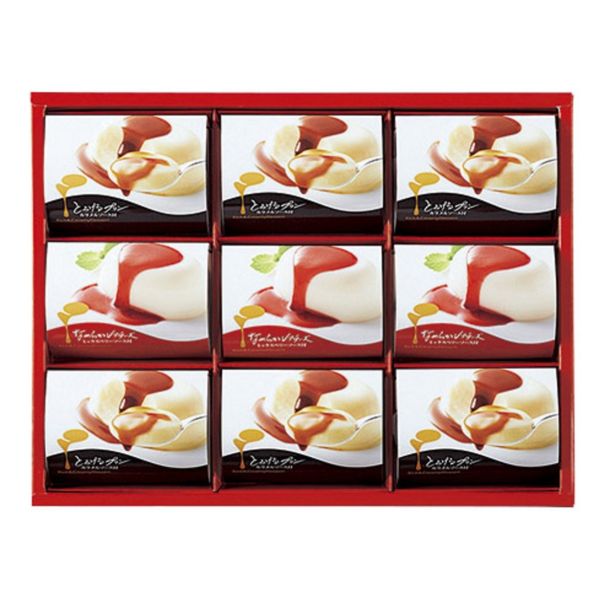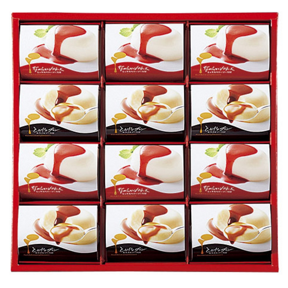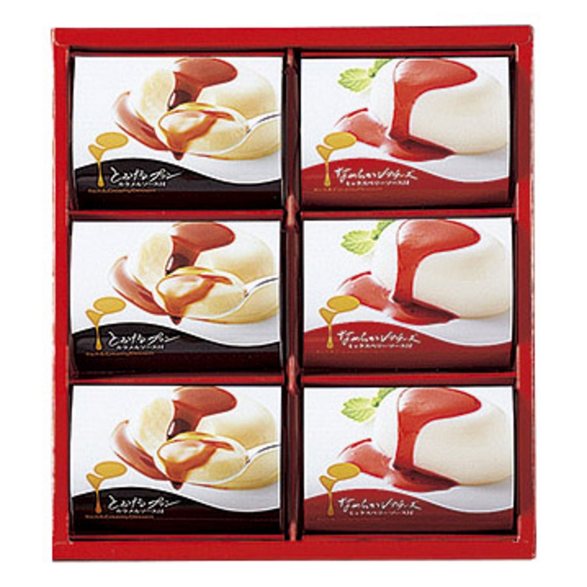 商品 : とろけるプリン72g (カラメルソース付)、なめらかレアチーズ72g (ミックスベリーソース付) 各3 加工地 : 日本【卵・乳】 箱 : 約21.5 x 24 x 4.7cm (化粧箱)