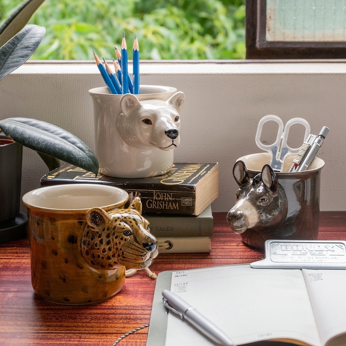 動物の顔がにゅっとマグからはみ出ちゃったような3Dマグ。ひとつひとつ丁寧にハンドペイントされているので色づけの際の筆跡が残っており、ハンドメイドならではの温もりを感じられます。ひとつひとつの表情にも個性があり、にくめない可愛さとゆるさに笑顔がこぼれます。 ペンホルダー・プラントポットカバー・大容量マグ…マルチに使えるどっしり存在感のある形です。