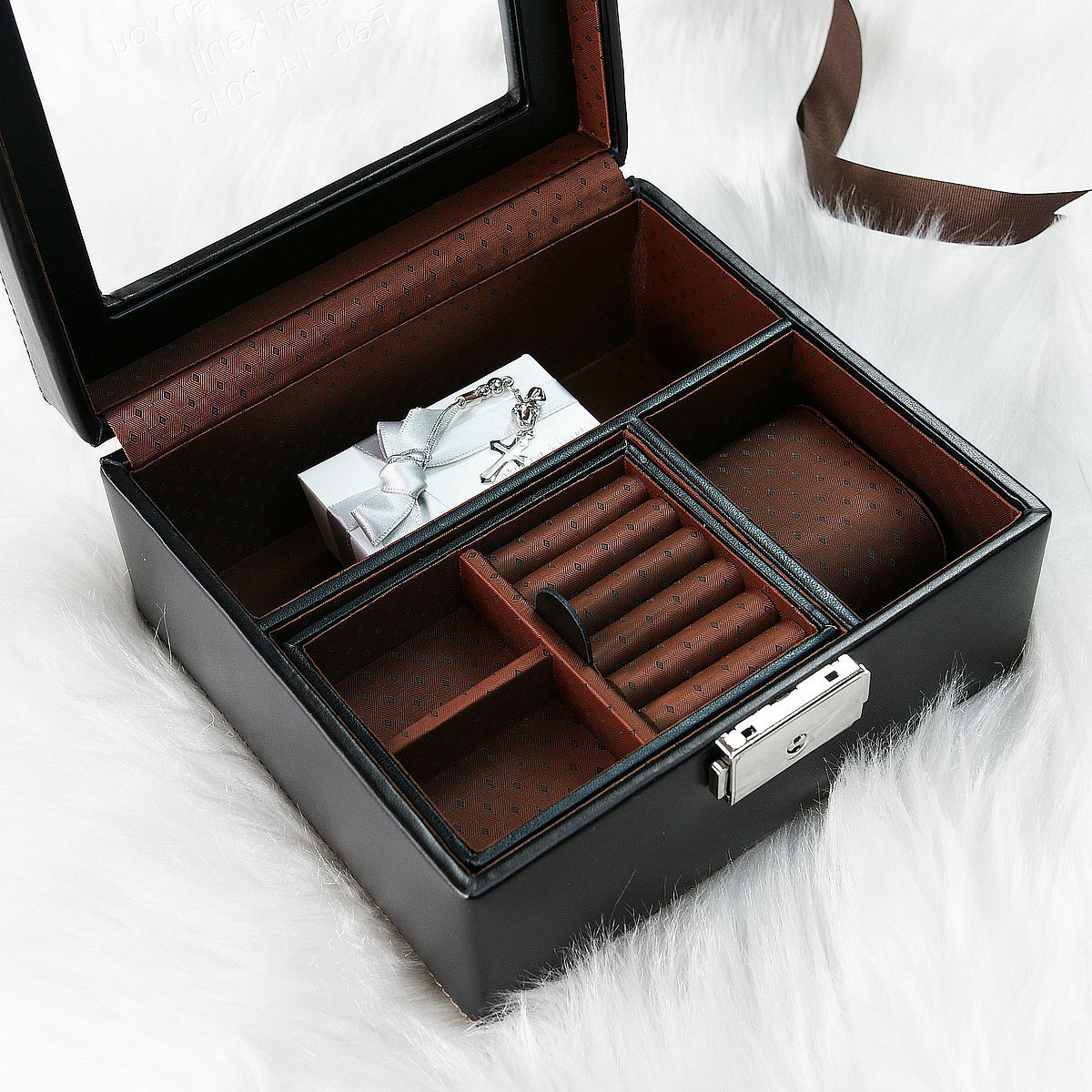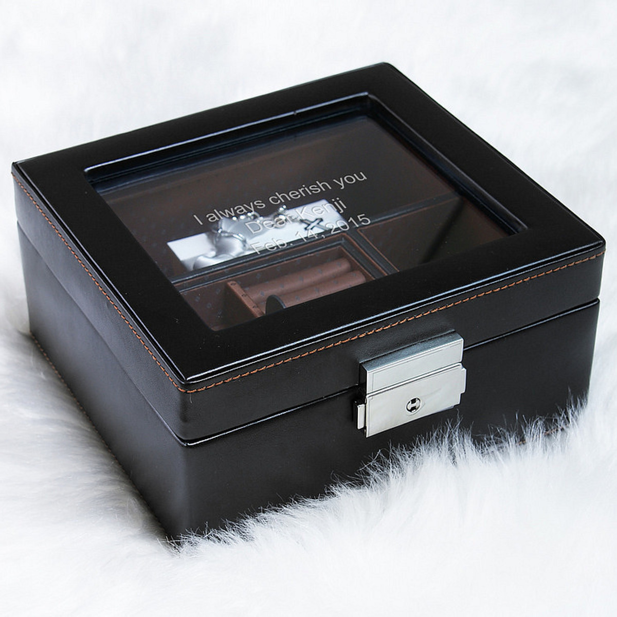 指輪、ネックレス、時計、サングラスなど。女性のようにたくさん持たないからこそ収納に困る男性にぴったりのアクセサリーボックスです。シックなブラックのカラーリングど内側のブラウンのモノグラムの生地がオシャレです。ボックスには鍵もついているので大切なプレゼントも保管してくれます。