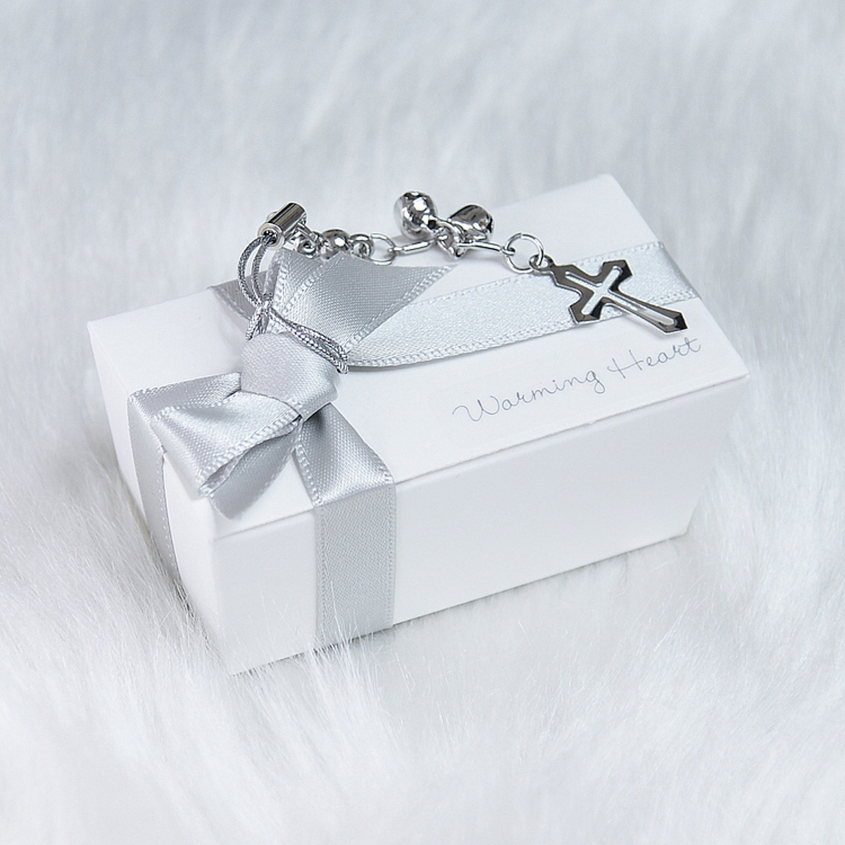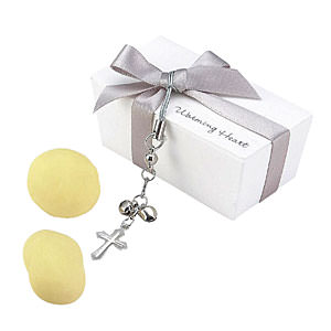 ホワイト×シルバーで構成されたシックでセンスのいいカラーパッケージ。クロスのアクセサリーチャームがポイントで付属。見た目的もオシャレなチョコボックスです。中には甘酸っぱい苺チョコが2個入っています。