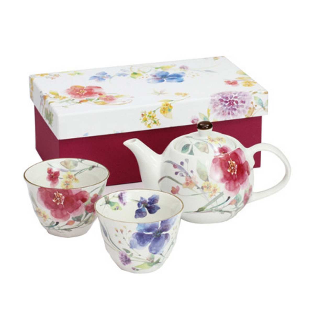 サイズ : 碗 (約Φ9.2xH6.7cm) x 2, ポット (約Φ11.5xH11.7cm, 560cc) 重量 : 約 1,000 g 材質 : 磁器 (碗・ポット) 箱 : 約 26 x 15.1 x 10 cm MADE IN JAPAN