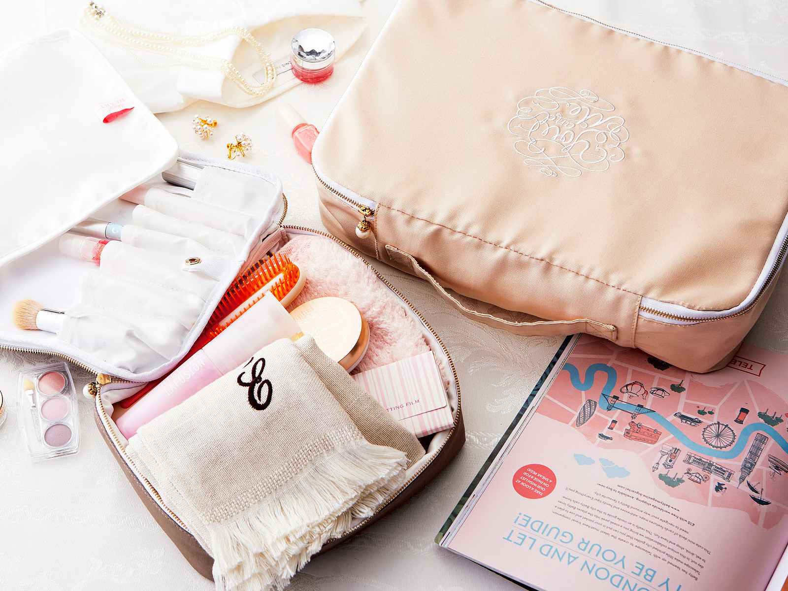 スーツケースの中や旅行鞄の中がすっきりまとまるトラベルポーチと、化粧品やメイクブラシなどがたくさん収納できるコスメポーチのセット。出張や旅行の際に一つ持っておくと便利です。使い勝手や素材感にこだわったりつつ、引手にあしらったパールと上品なデザインが女子気分を上げてくれます。