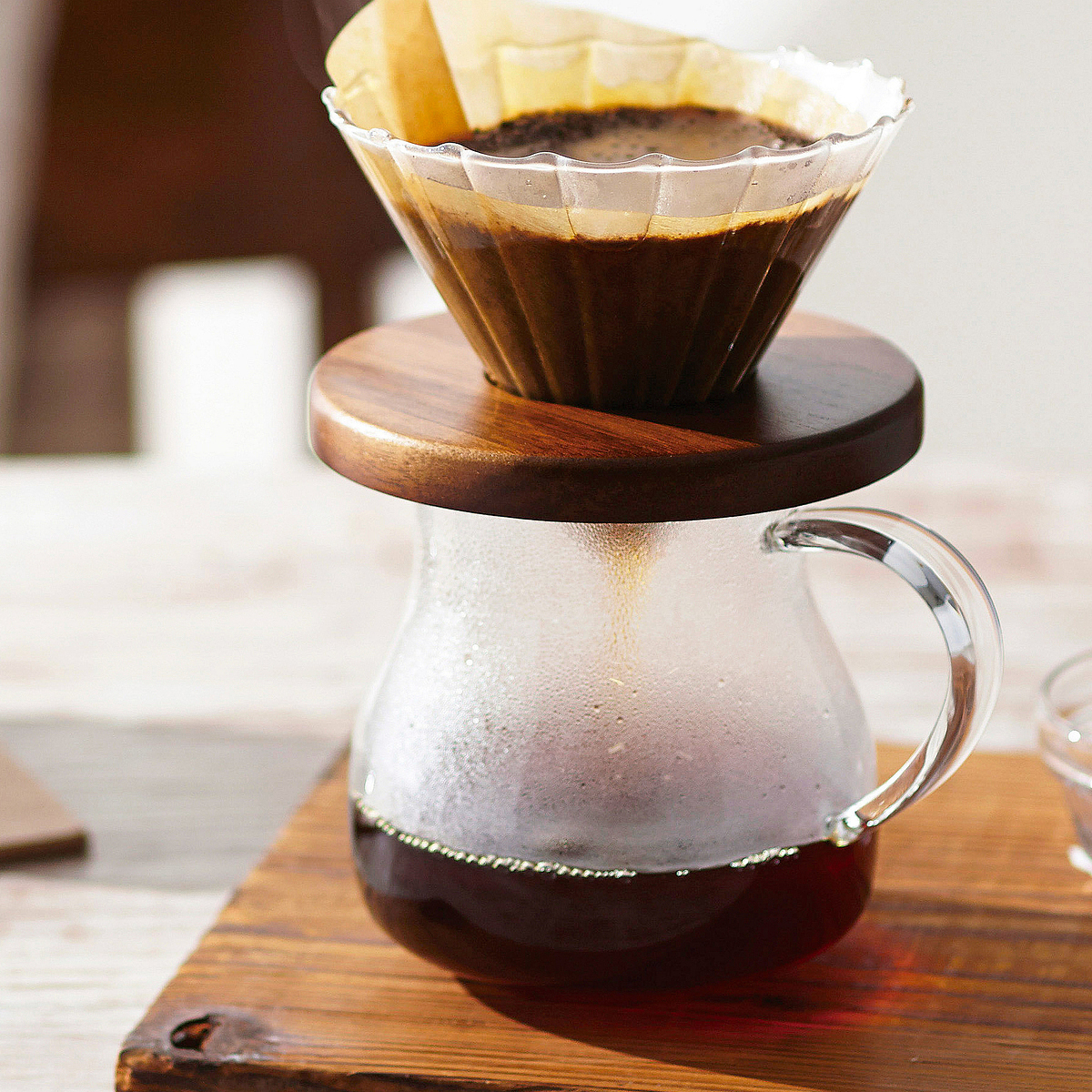アカシアのホルダーと花のようなドリッパーの相性がとってもおしゃれな M-MODE CAFE STYLE のコーヒーサーバーセットです。キッチンに置いておくだけでもインテリアになる素敵な佇まいです。