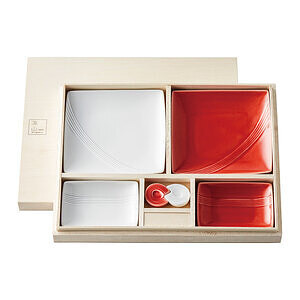 紅白のおめでたいカラーのプレートセット。紅白の箸置付きです。縁起を担ぐお祝いの贈り物としてはもちろん、自宅でお祝いするときの演出にもオススメです。
