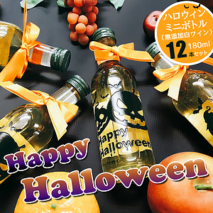 2人のハロウィンパーティに!ハロウィーンデザインが刻印されたペアのワイングラスと、インスタ映えな白ワインのミニボトルは漆黒のブラックカラーのジャック・ザ・ランタンデザイン。当店オリジナルのハロウィンデザインが刻印(シールや印刷ではありません。)されているボトルです。白ワインは無添加なので悪酔いしにくい、甘口だけどすっきりとしたキレのある味、ほどよい飲みやすさで食事にも合います。みんなでハロウィンパーティで乾杯!