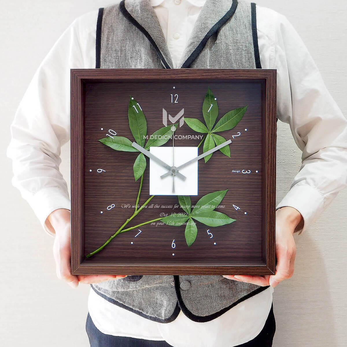パキラのフェイクリーフを使った時計に、ご希望のロゴとメッセージが入ります。ロゴ入りのプレゼントで、もっとサプライズなプレゼントをオーダーしませんか。 パキラは "発財樹" や "Money Tree" とも呼ばれ特に金運に良いとされていますので、贈り物にも最適です。