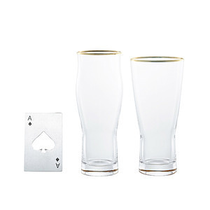 2種類の形状でビールの刻や香りを一層引き出します。反った口元で口あたりを味わう口あたりグラスと広い口径で爽快な喉ごしを愉しむのどごしグラス。今日の気分はどちら?トランプカード型のボトルオープナーもオシャレです。