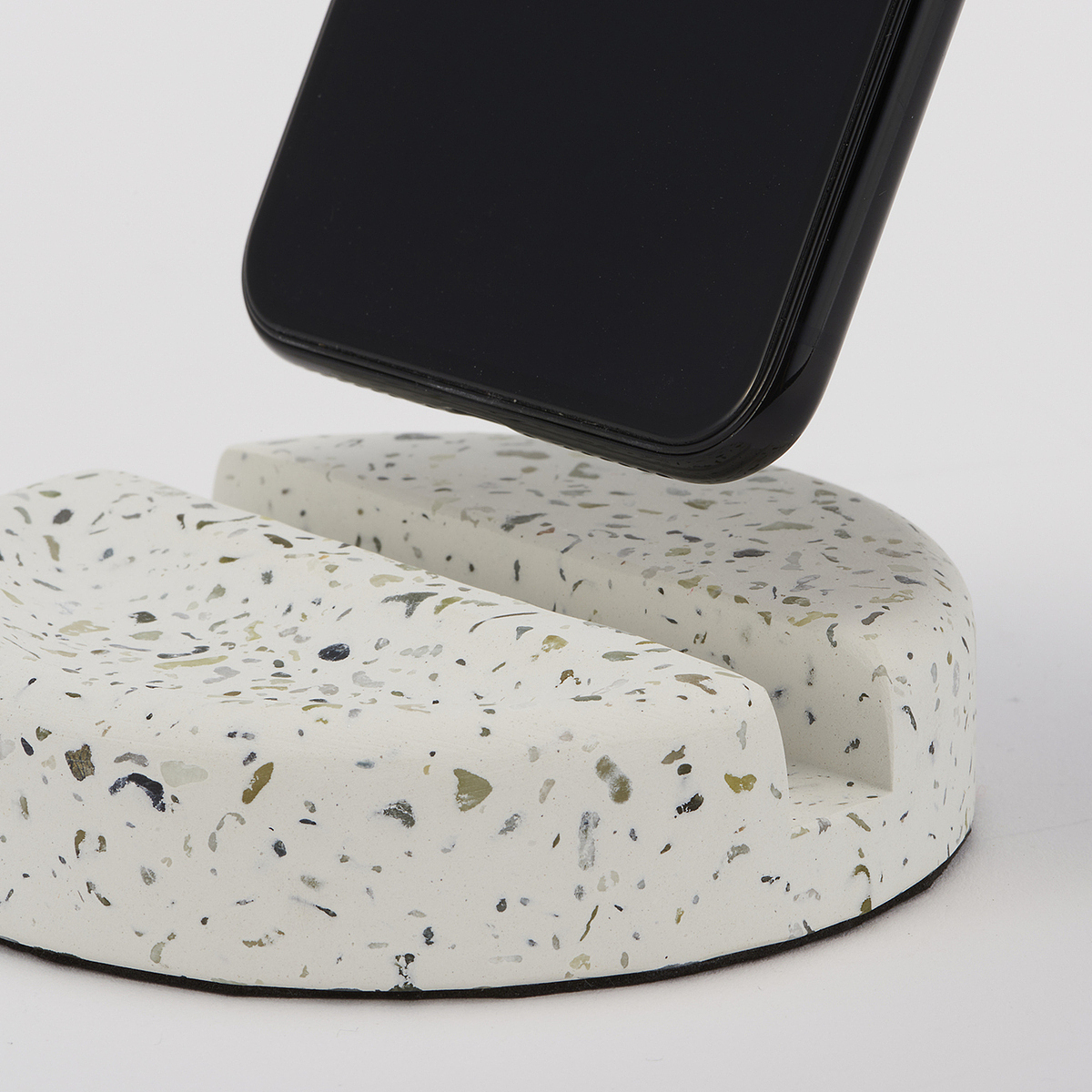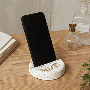 素材にセメントを使用したトレンドを感じる卓上用小物。落ち着きある色合いのテラゾーのナチュラルな素材感、安定性抜群の使い勝手の良さ、お部屋のアクセントにもなり、お洒落心をくすぐる魅力に溢れています。アクセサリーを置けるくぼみもあるので、愛用品はこちらへどうぞ。 スマートフォンの機種やカバーによっては溝に収納できない場合がございます。スマホを置く溝の幅は約 12 mm です。