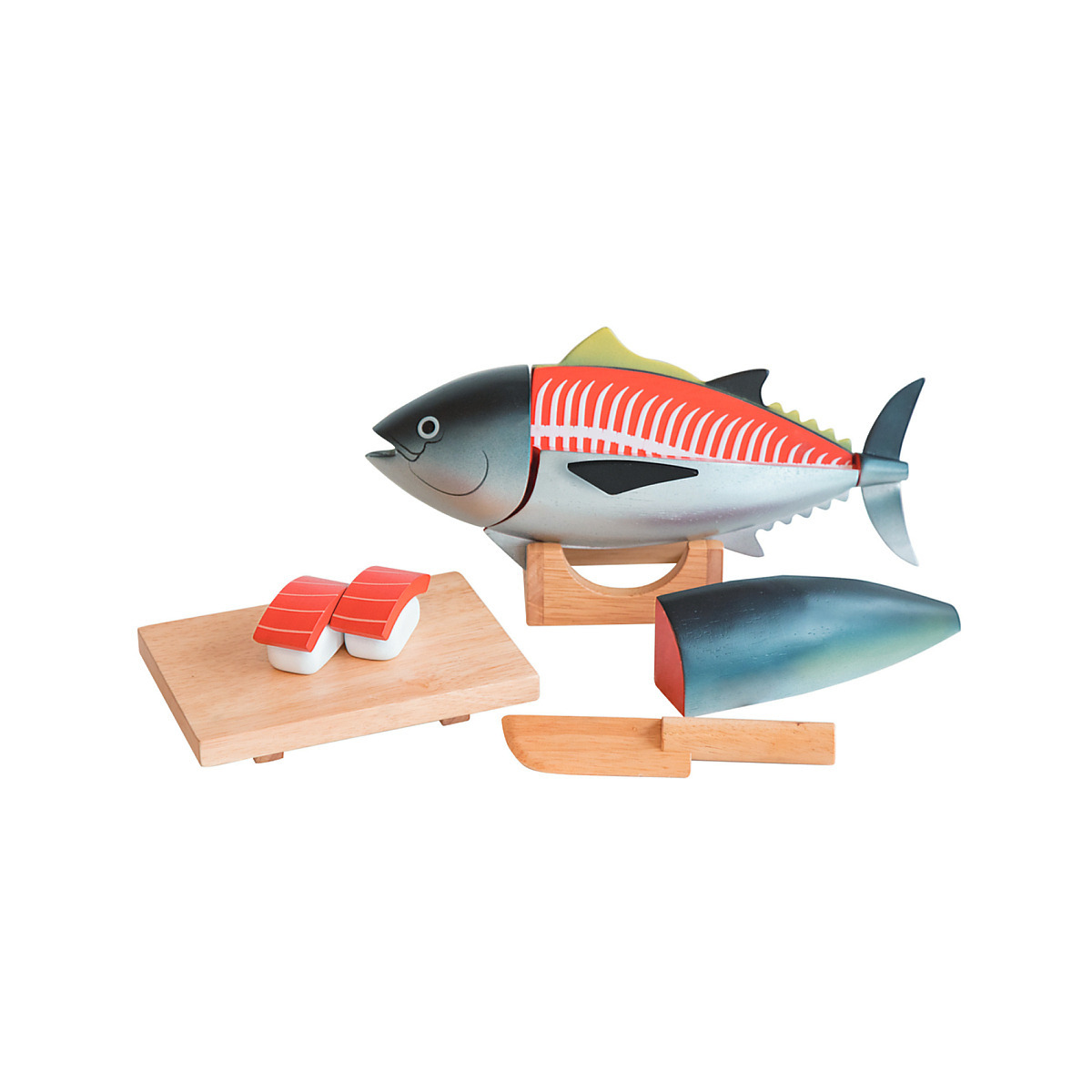 商品 : マグロ x 1 (頭・背中右側・背中左側・中落・腹右側・腹左側・尻尾 各1), 寿司下駄 x 1, 包丁 x 1, スタンド x 1, 刺身 x 2, シャリ x 2 サイズ : 約 W30.7 x D11.5 x H12 cm (組立時) 重量 : 約 1500 g 材質 : 天然木, 磁石 対象年齢 : 3 才~