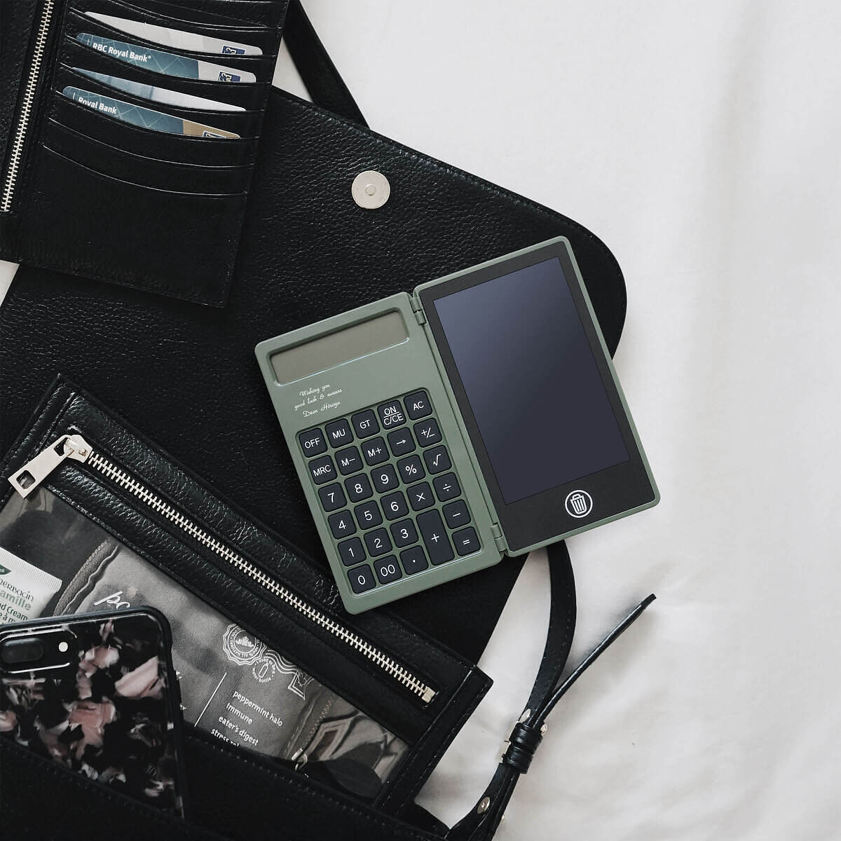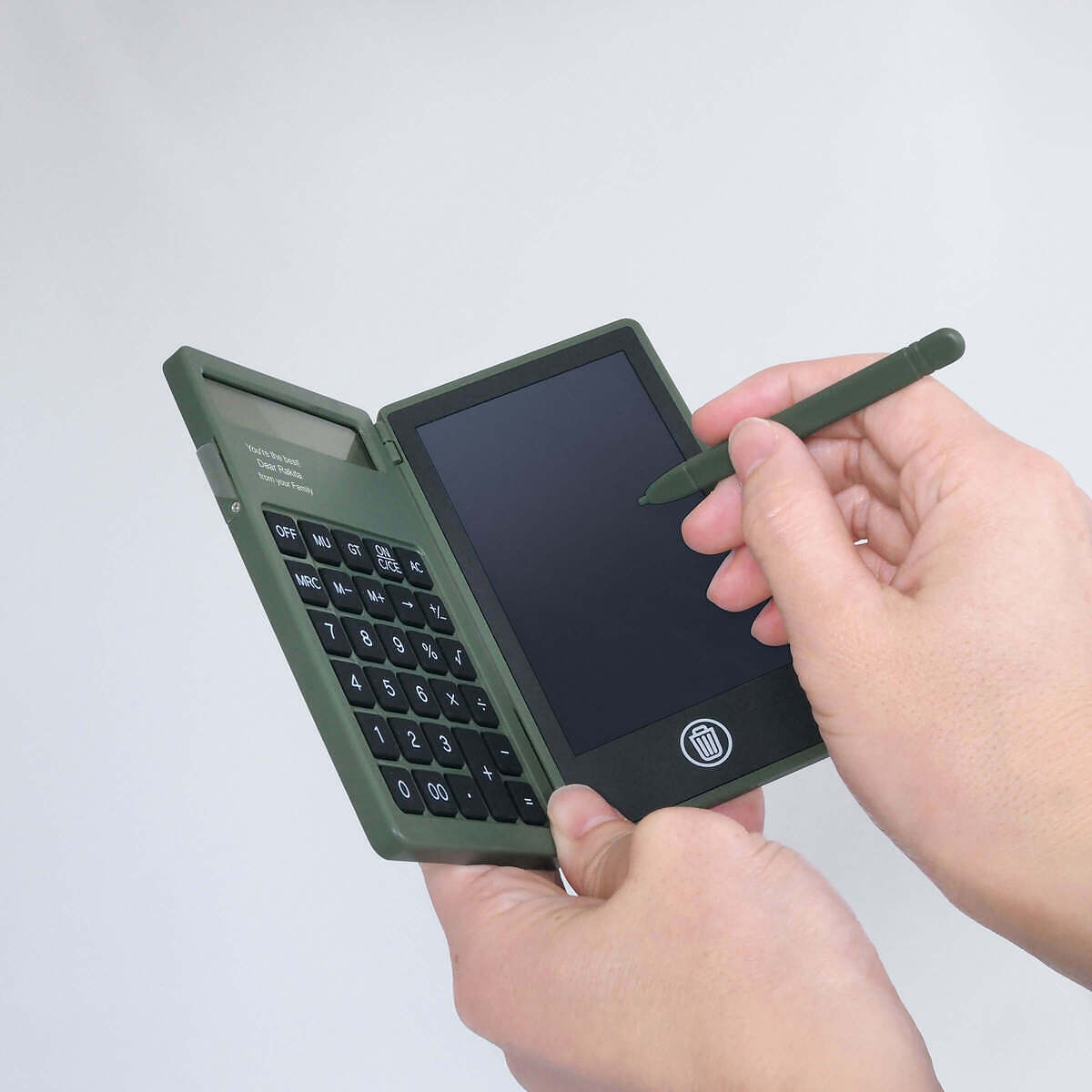 12ケタ表示の電卓と4.4インチの電子メモがセットになった便利アイテム。手帳型でコンパクトに折りたためるのでメモの画面を傷つけず、バッグの隙間やポケットに入れて持ち運べます。