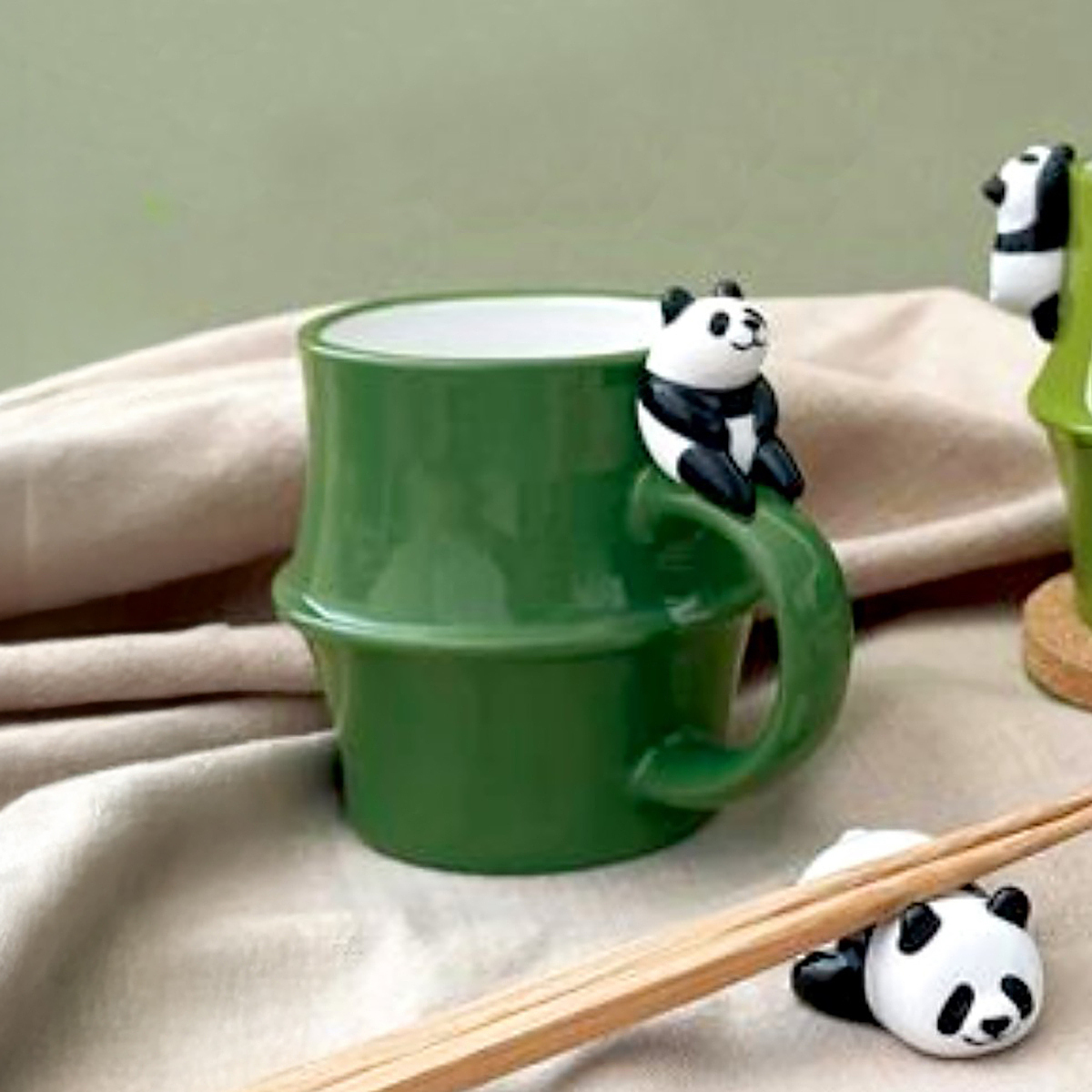 おっちょこちょいな白黒カラーの人気者、パンダのテーブルウェアが登場です。竹を模したマグにちょこんとパンダが。ころんと可愛いパンダと一緒にのほほんティータイム!実はパンダは木登り上手でスプーンの軸をするする~っと登ります。ごろごろ、ぐで~っと自由に過ごすパンダのポーズが箸置きになりました。マグカップ&スプーン&箸置きの3点セットです。