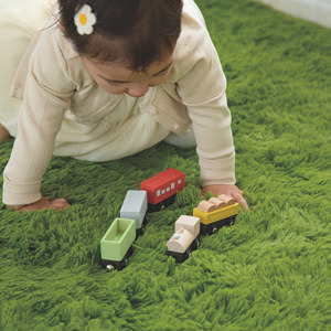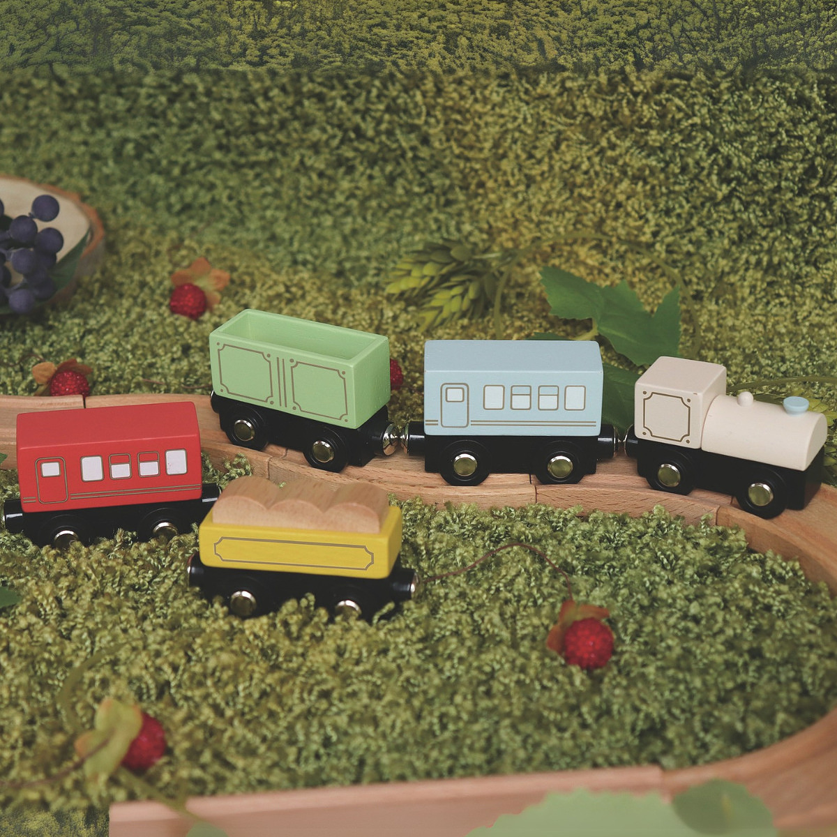 低年齢から遊べる、天然木ののりものおもちゃ。みんなが眠った夜空の中、夢や荷物・誰かの大切な手紙を乗せて走る列車たちをイメージしたデザイン。小さなお子様が持ちやすい手のひらサイズの列車のセットです。タイヤが動くので、ガタンゴトンと動かして楽しく遊べます。視認性が高くココロ躍るフルーツカラーを採用。シトラスグリーンやホワイトベージュ、水色などリアルな車業界のトレンドカラーです。「赤い列車はどれ?」などの会話から色を覚えるきっかけになります◎ 列車の後ろ、車両の前後に磁石がついているので、自由に連結して遊ぶことができます。両手を使ってピタッとくっつけて走らせよう!「1つだと短いね」「たくさん繋げると長いね!」たくさん繋げて長さ比べも楽しめます。