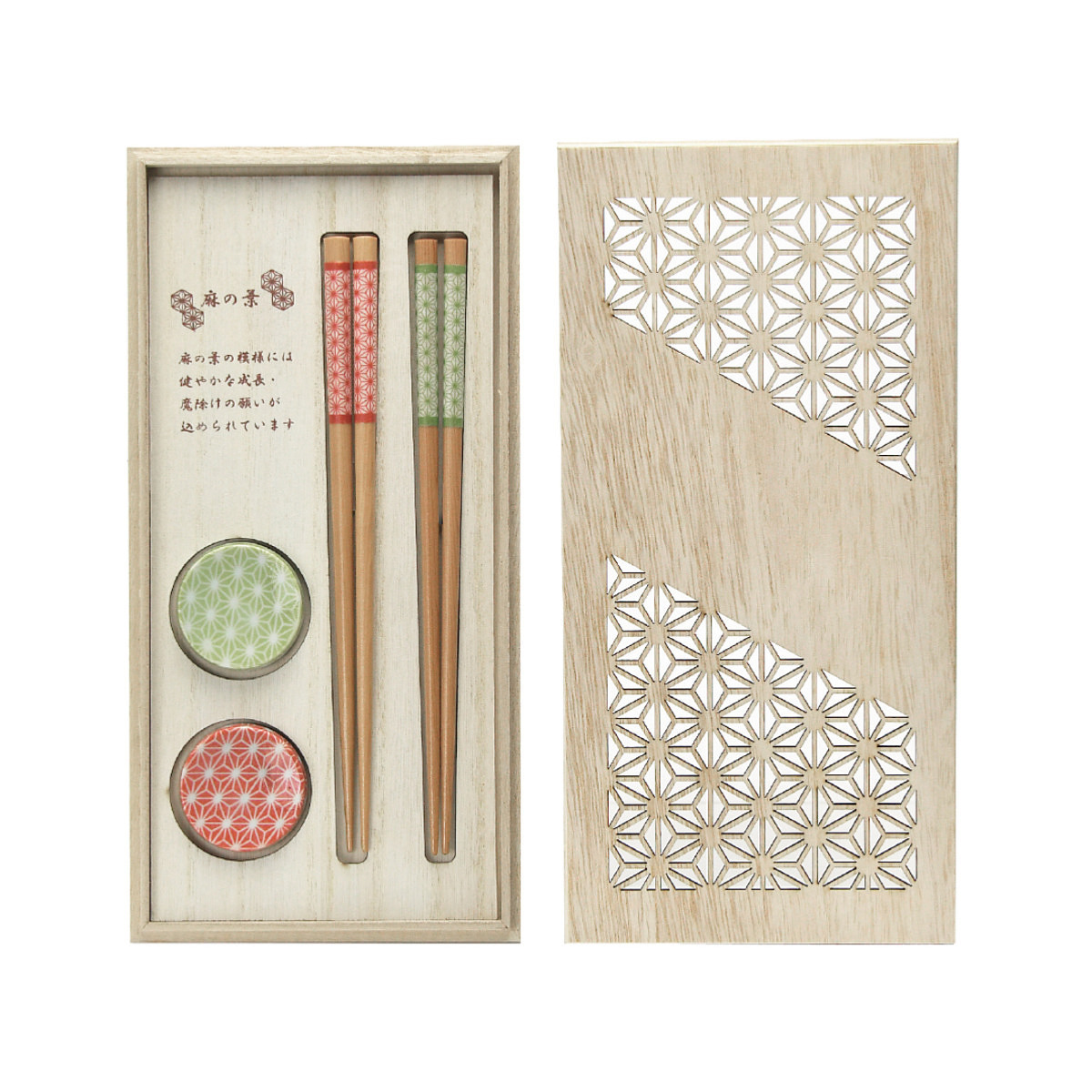 箸はデザインされた和紙を手作業で巻いており、箸置きも銅板転写を手作業で張り付けており、それぞれ素地の良さをいかした優しい色合いを表現しました。 箸、箸置きとも丁寧な手作業を施した一品です。 【麻の葉】 麻の葉の模様には健やかな成長、魔除けの願いが込められています