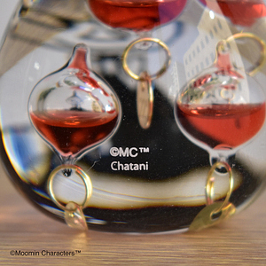 物理学者のガリレオ・ガリレイが発見した「液体の比重が気温によって変化する」原理を用いて作られた温度計。ガリレオ温度計とも呼ばれます。実際の気温は上層部に浮いているガラス球体の最下段のガラス球体に付いているプレートで読み取ります。 お部屋に置きやすいコンパクトなサイズ感で、ギフトにもぴったりです。ムーミン、リトルミイファンはもちろん、一味違うお洒落なインテリアをお探しの方、科学の不思議に興味を持つ年頃のお子様にもお勧めです。