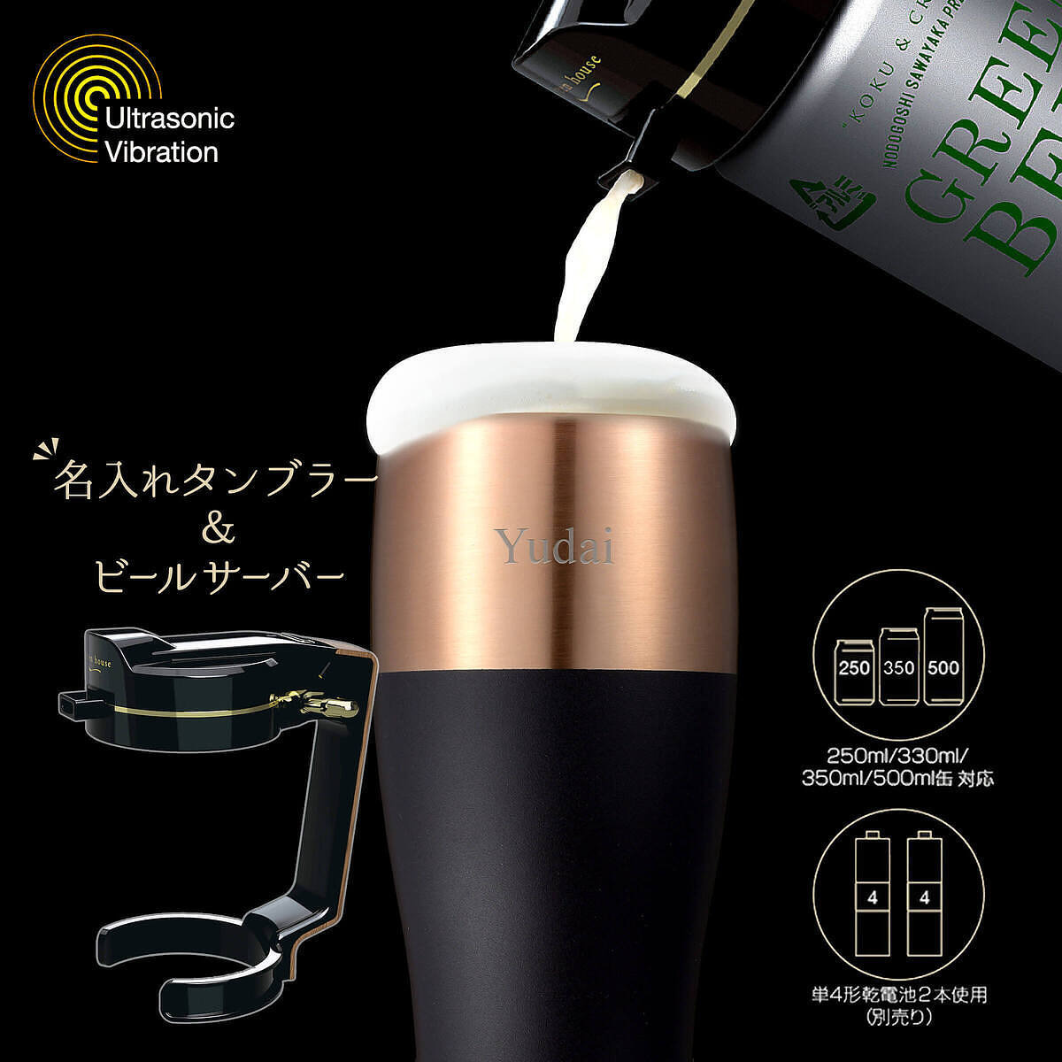 超音波が生み出すきめ細かいクリーミーな泡が楽しめる、缶ビールで注げるハンディビールサーバーをセット。極上の泡をご自宅で楽しめます。