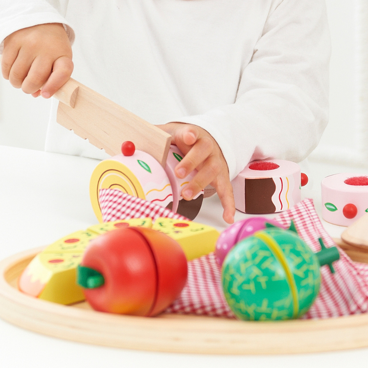 ケーキやピザ等パーティーならではのわくわくする食材のセット。2本の包丁でまねっこ遊びができます。ざくっと切れる食べ物に子どもたちは大喜び!面ファスナーなので包丁を入れやすく自分でできた!の達成感と挑戦する気持ちを育みます。トレーをひっくり返せばまな板としても使用できます。