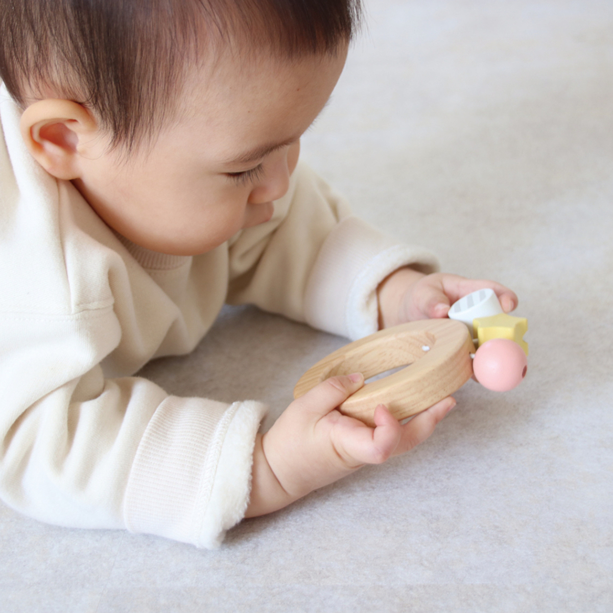 キャンディのようなビーズがかわいいラトル。赤ちゃんの手で握りやすいデザインで、振るとお星さま・丸・円柱のビーズがカラコロやさしい音色を奏でます。出産祝いの贈り物やお誕生日プレゼントなど、ベビーにぴったりなかわいらしいデザインです。