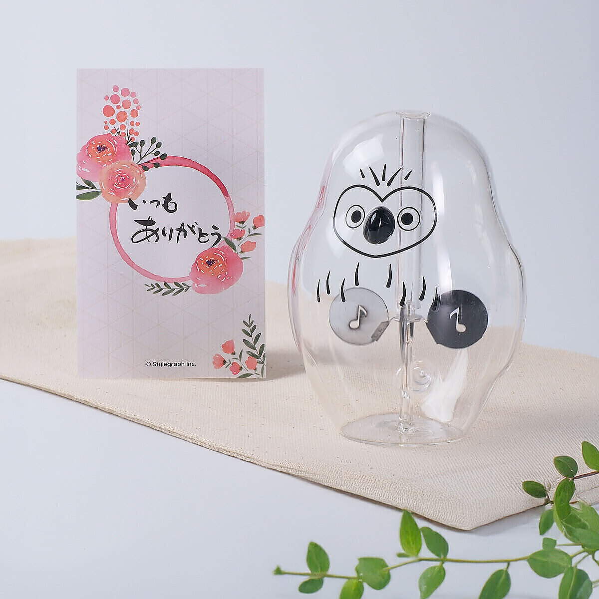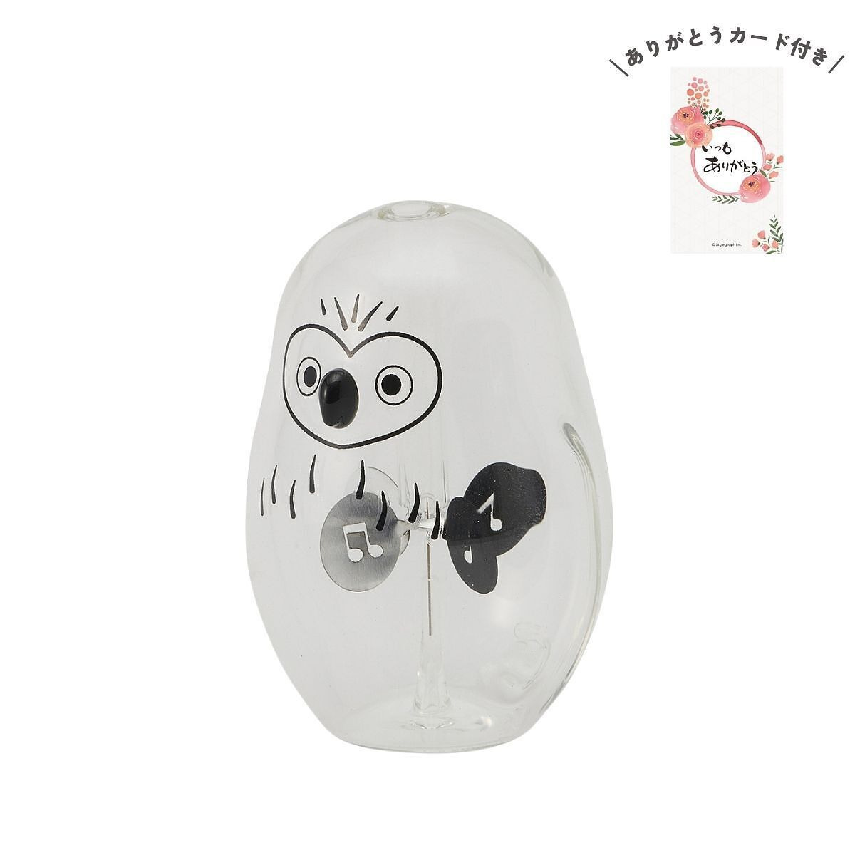 シルエットが愛らしくも感じるふくろうデザインのオブジェ。太陽光や白熱灯を浴びると、その熱を吸収した4枚の羽根がくるくると・・・しかもスピードは当たる光の強さによって変化するという面白さも含んでおり、見た目と動きの両方で日々楽しませてくれるハイセンスな一品です。玄関や窓際のインテリアとして、ぜひ。 光熱に照らされるとガラス内の4枚の羽根が回転します。窓辺に置けば太陽光で、室内にあれば白熱灯などに反応して回転し続けます。光の強弱に比例して、回転する速度が変化します。光が強いと回転する速度が上がります。 本来ラジオメーターは1870年代に英国人・物理学者クルックスによって考案されたソーラーエネルギーを運動エネルギーに変える実験器具です。蛍光灯には反応せず、太陽光や白熱灯に反応します。 感謝の気持ちを伝えるカードを添えてお届けします。名刺サイズのおしゃれなギフトカードです。裏面は無地なので、お手元で一言書き足すこともできます。