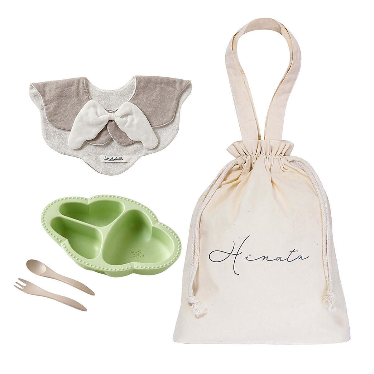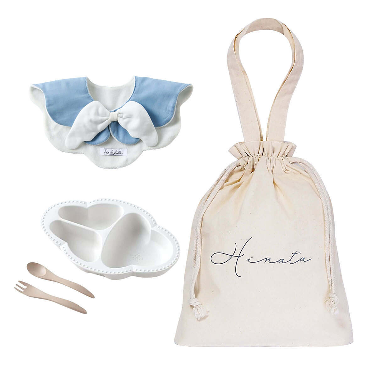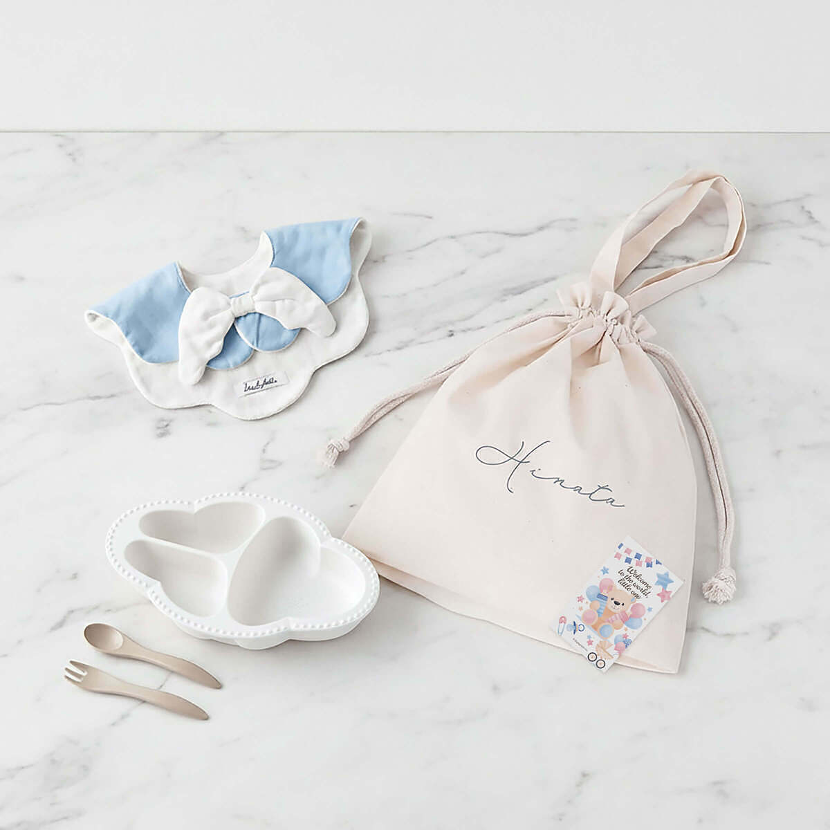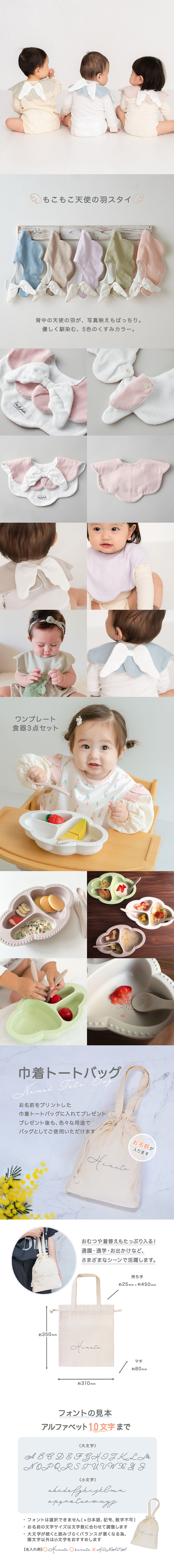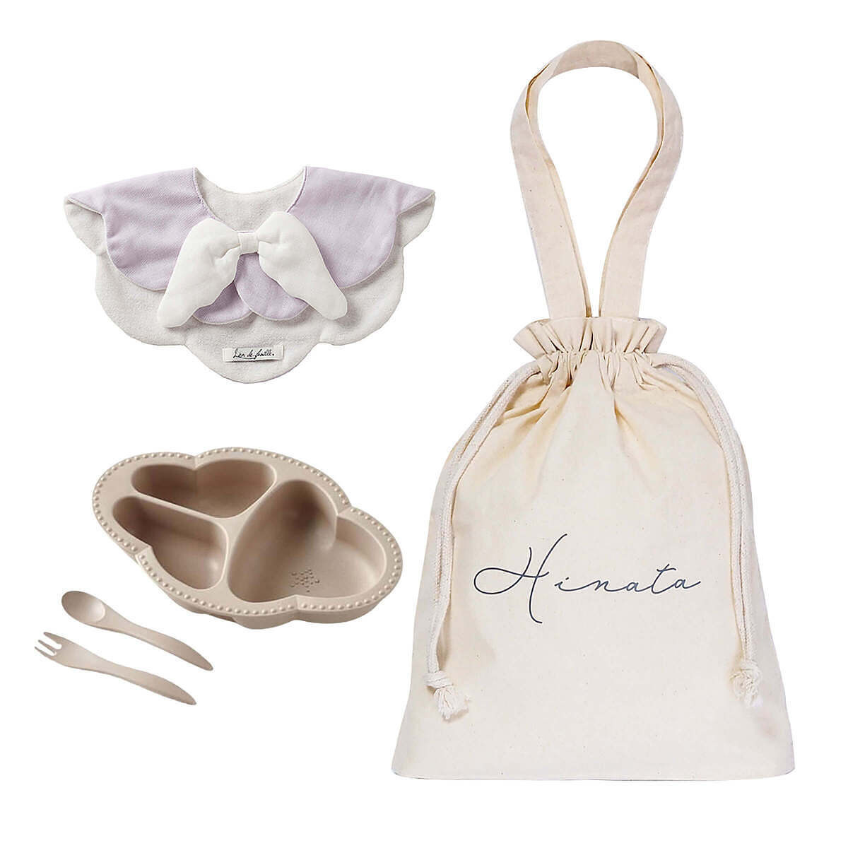 天使のスタイとワンプレート食器3点セットを、まとめて巾着バッグでラッピングしたギフトセットです。