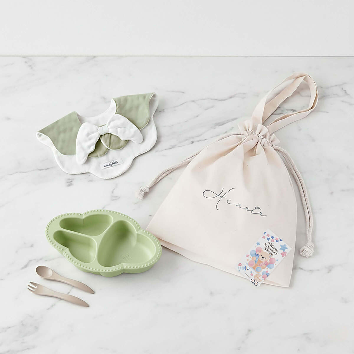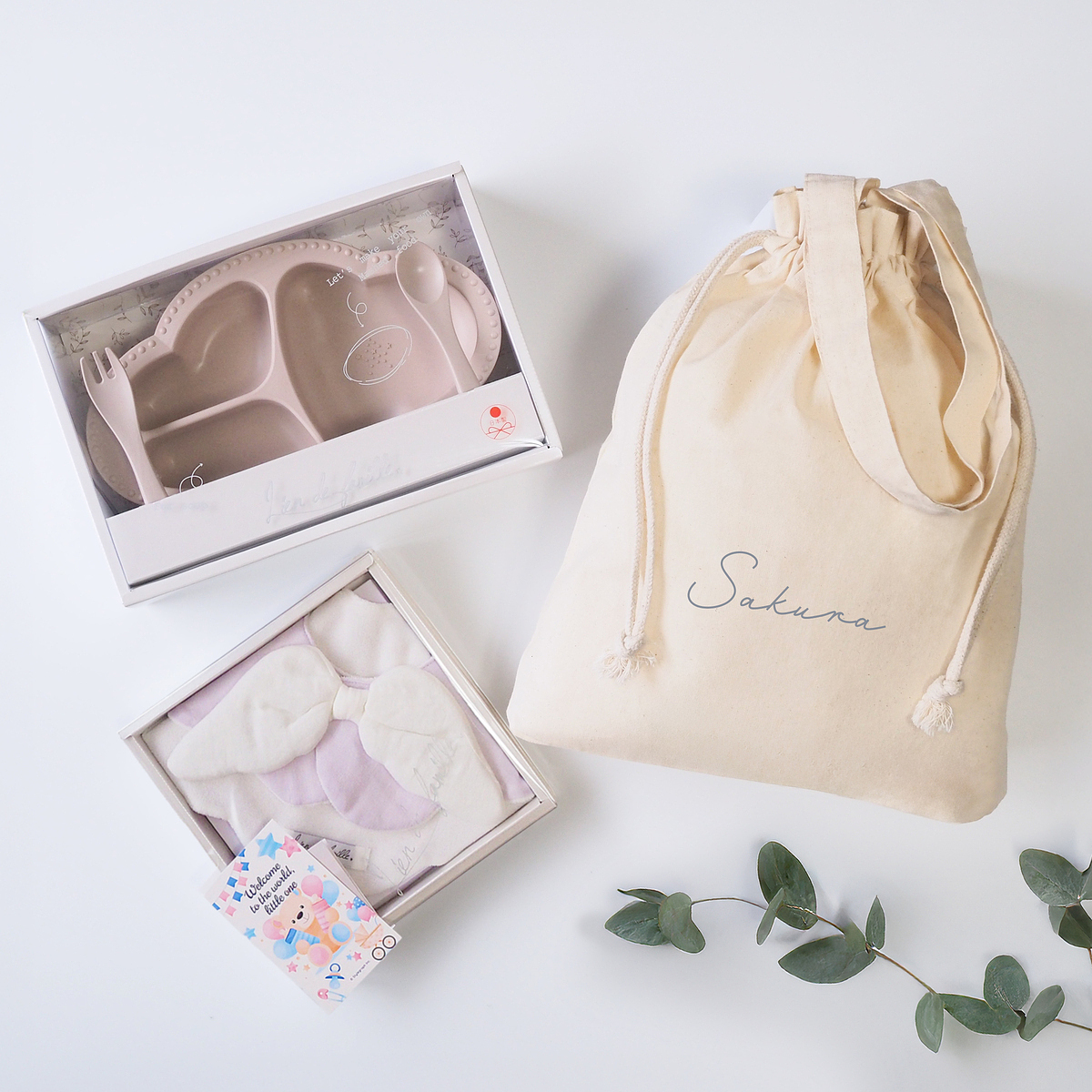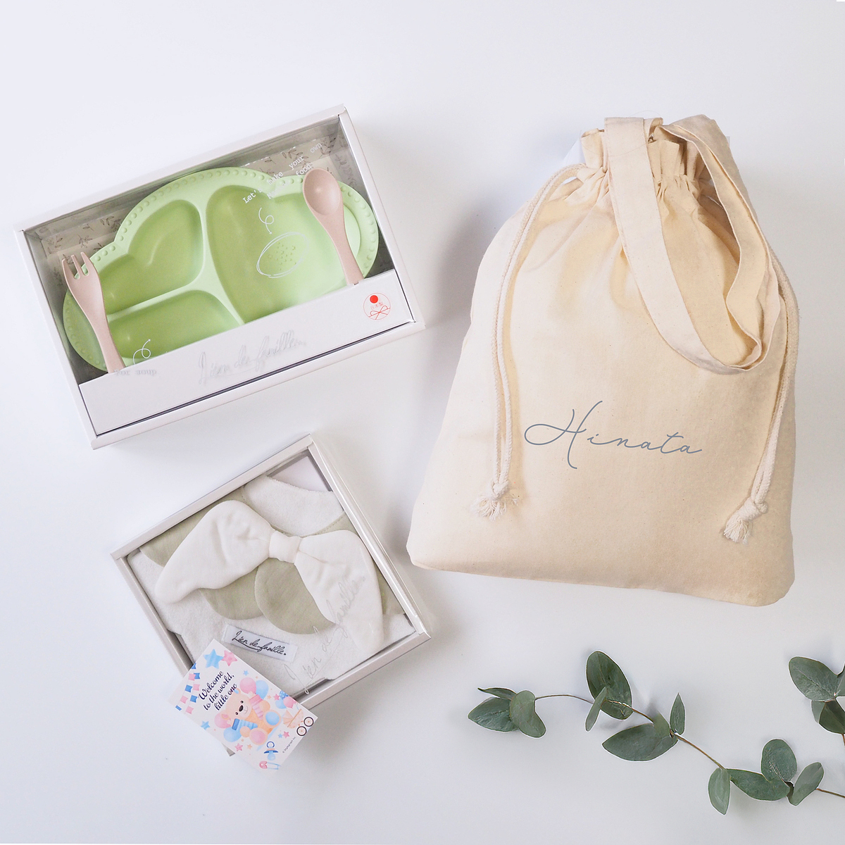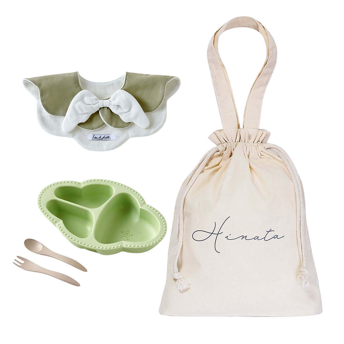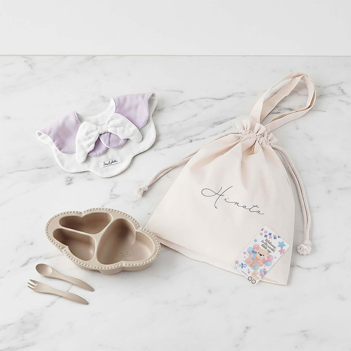 天使のスタイとワンプレート食器3点セットを、まとめて巾着バッグでラッピングしたギフトセットです。