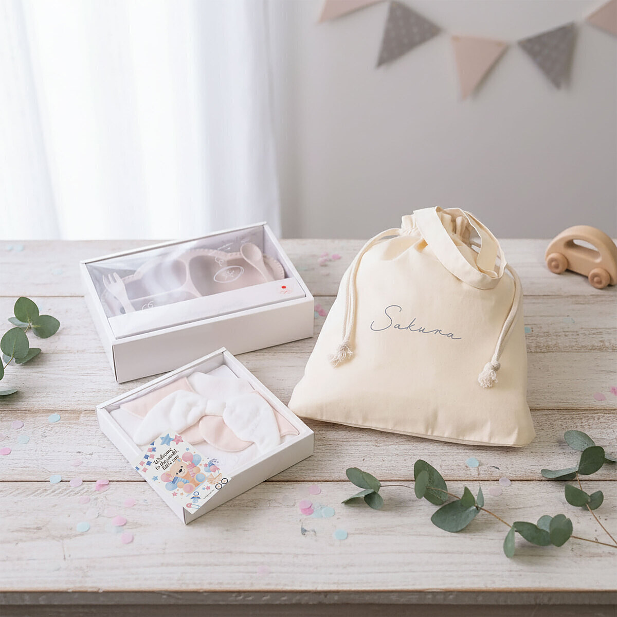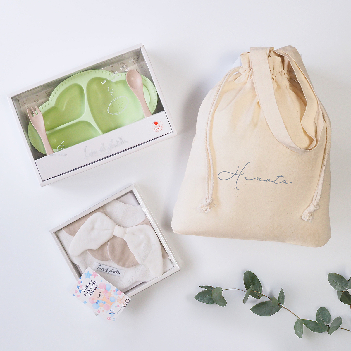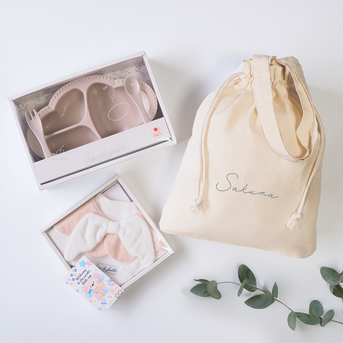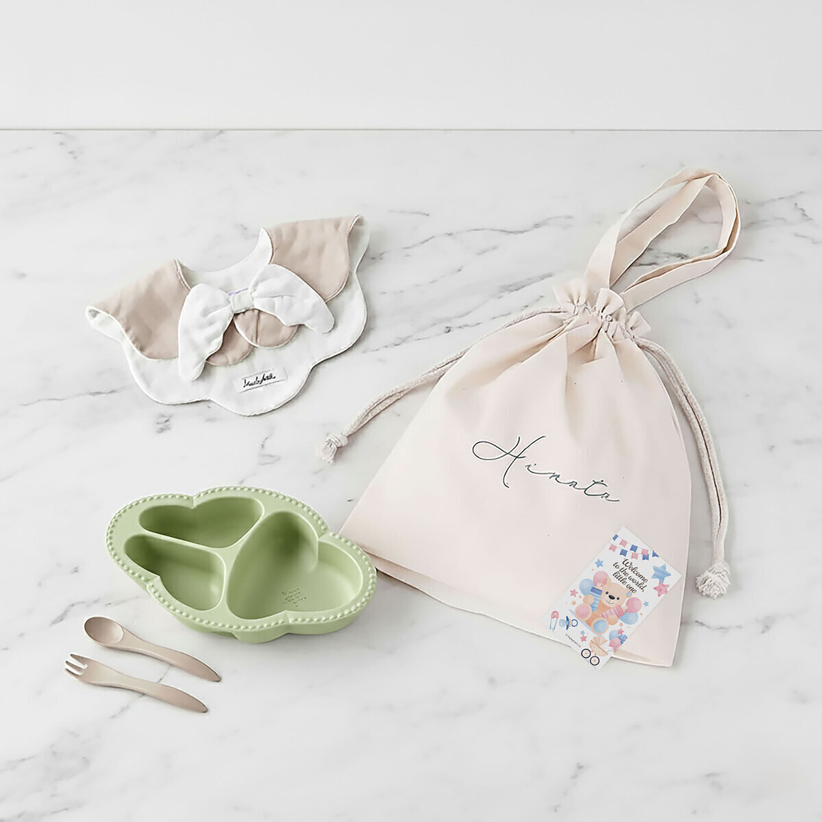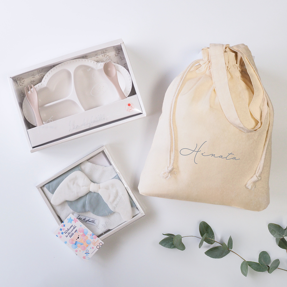 天使のスタイとワンプレート食器3点セットを、まとめて巾着バッグでラッピングしたギフトセットです。