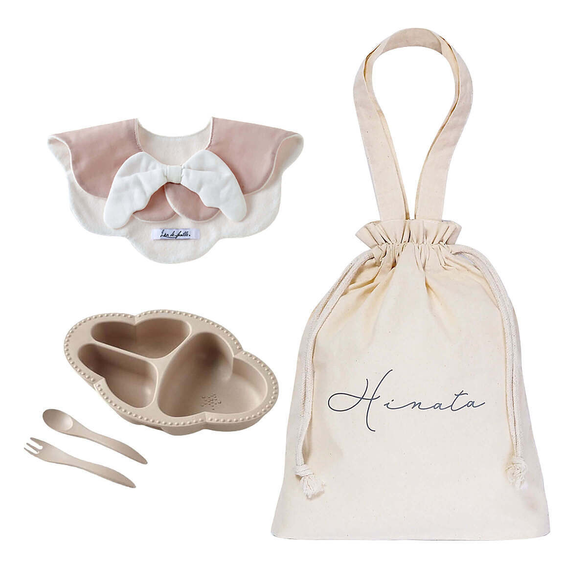 セット内容 : もこもこ天使スタイ ピンク, ワンプレート食器3点セット ベージュ, 巾着トートバッグ