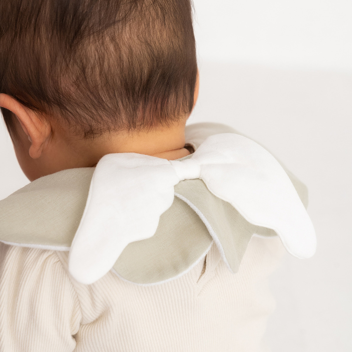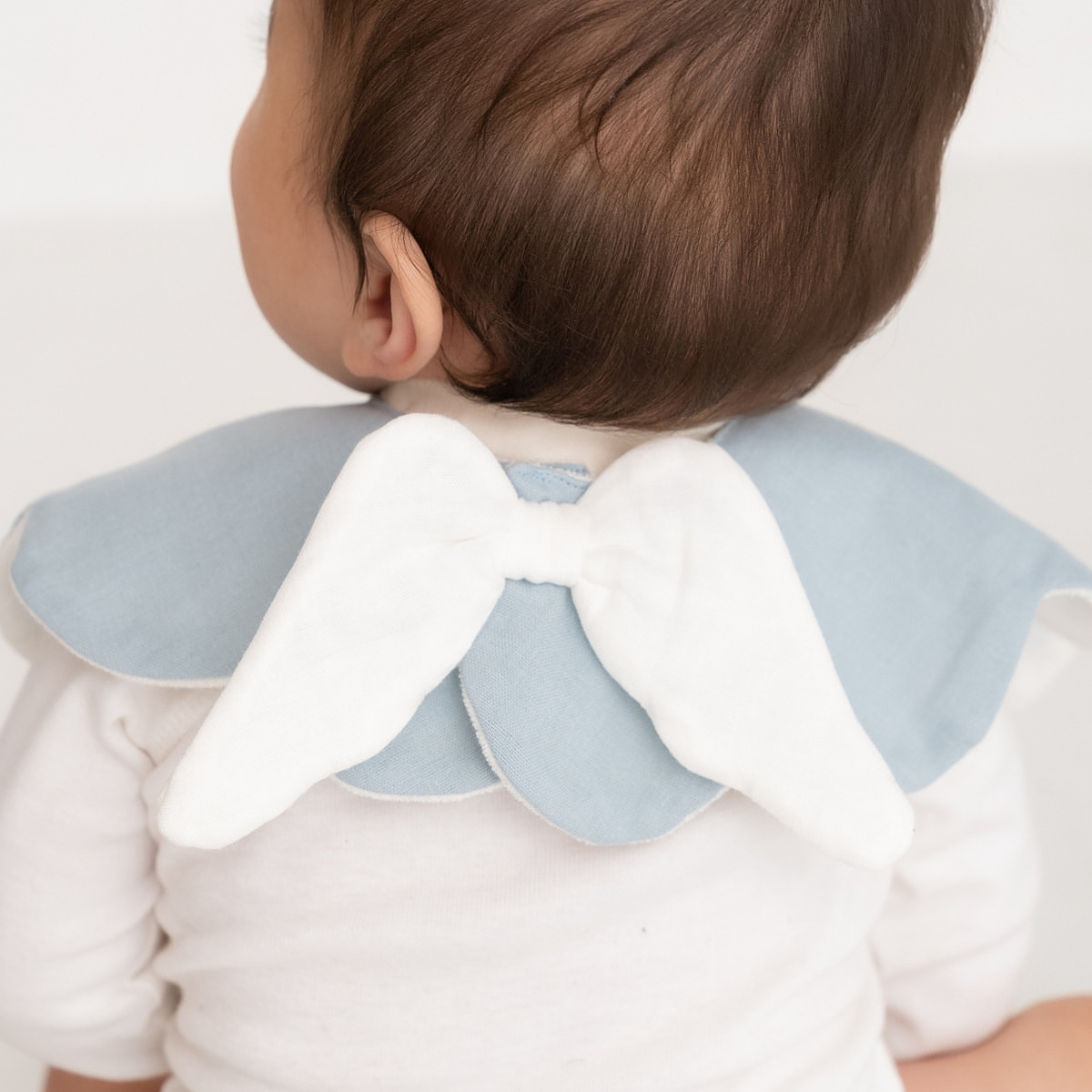 赤ちゃんの可愛さを倍増させてくれる天使のスタイ。綿100%でお肌に優しく、裏面はパイル素材で吸水性も◎。使いやすい大判サイズで、プラスチック製スナップで着脱が簡単です。