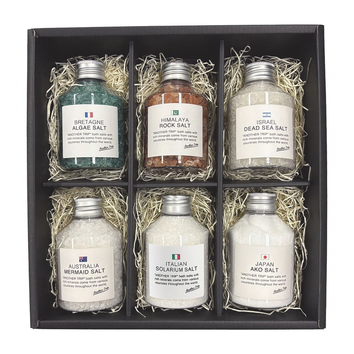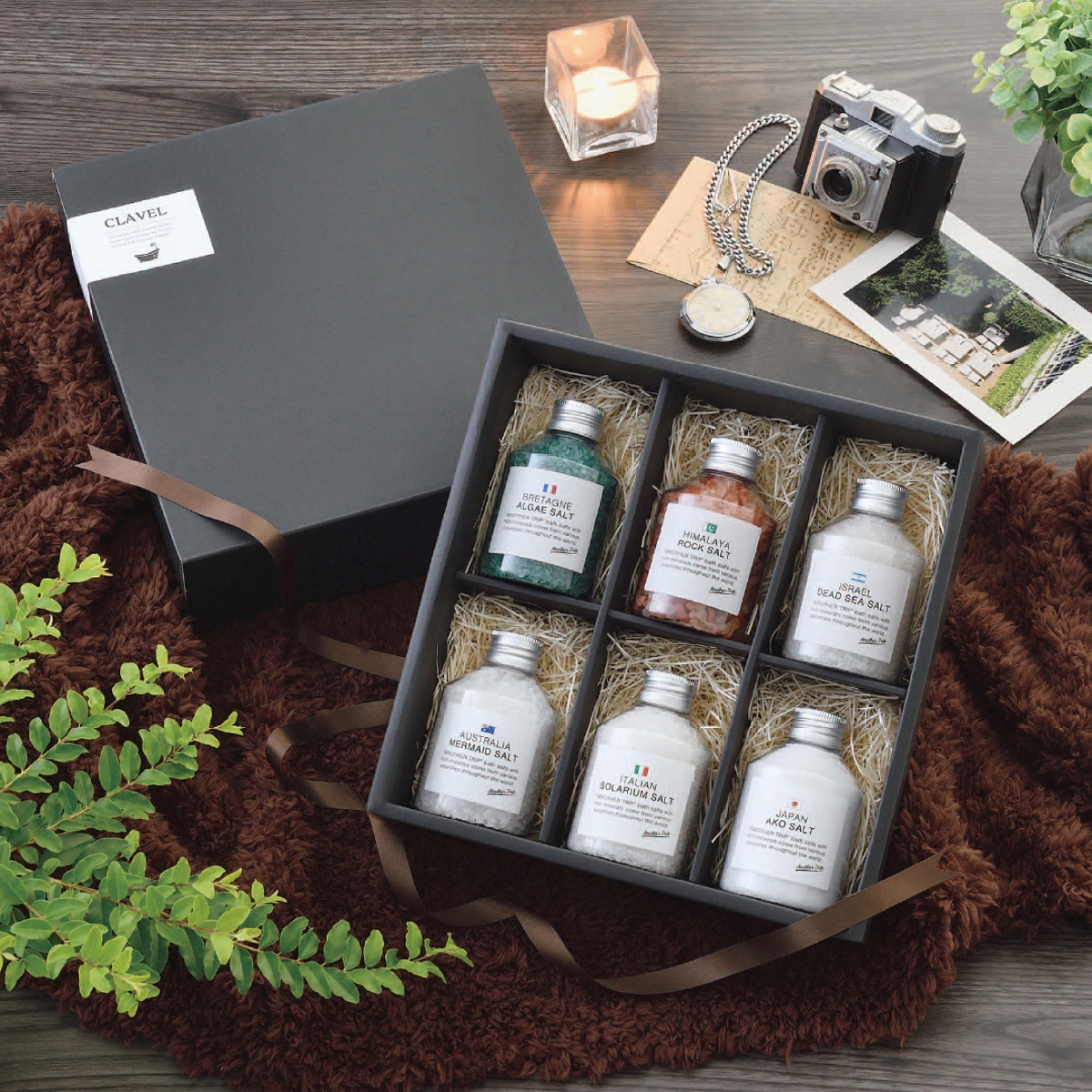 世界中から厳選したバスソルトを詰め合わせた「アナザートリップ®︎NA CLAVEL(クラヴェル)」。 CLAVEL 6(クラヴェル シックス)は、アナザートリップ®︎NAの中でも特に人気の3種類に、粒のサイズが違う白く輝くソルト3種を加えた6種をセットしました。 大切な方へ贈りたい、大自然の恵みと心安らかな時間…。 各国の自然の恵みそのままに、贅沢なバスタイムをお届けします。