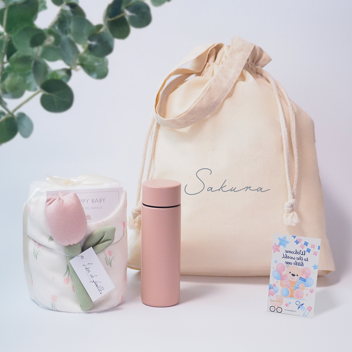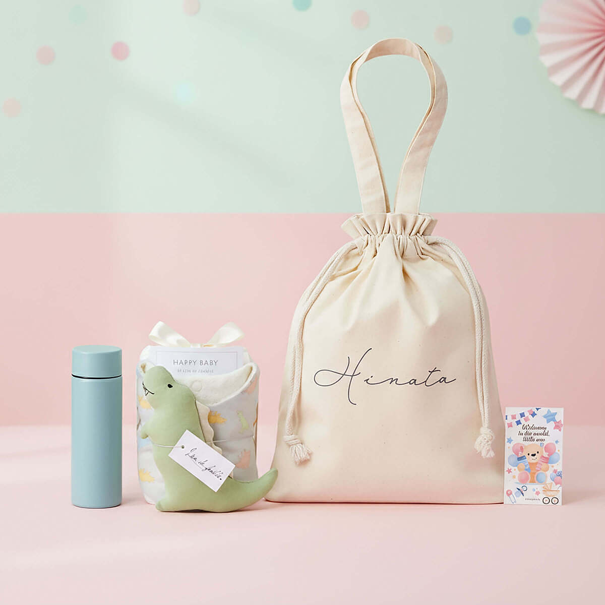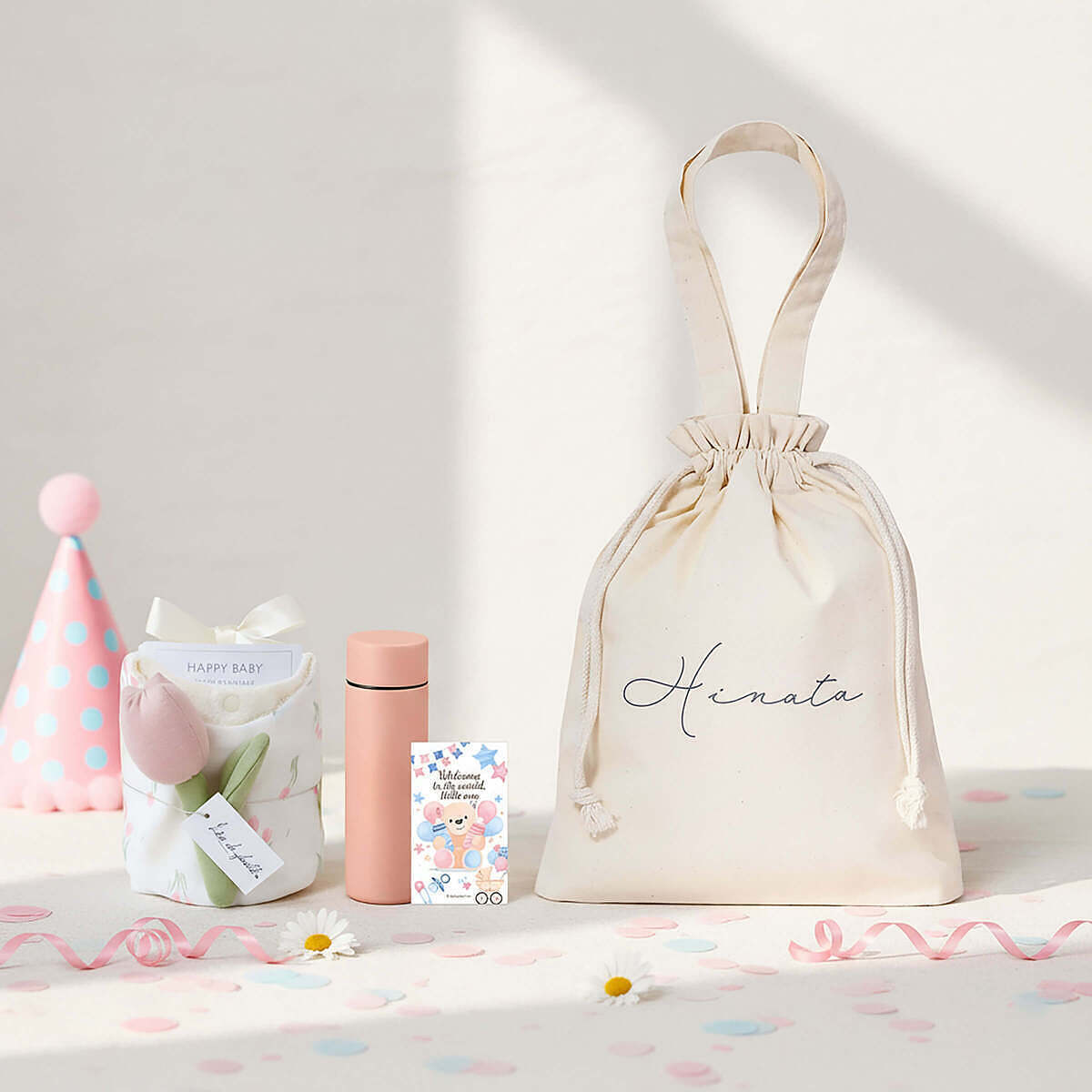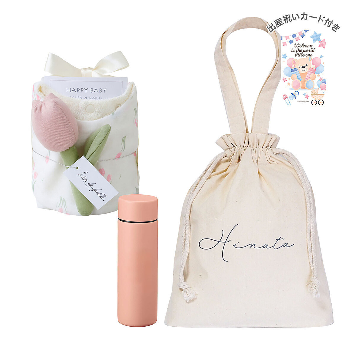 名前をお入れしたオリジナル巾着トートバッグでラッピングをしておお届けします。 出産祝いのギフトにおすすめ、スタイとラトルで飾ったオムツケーキと、ミルク用のお湯にもピッタリなミニボトルを多用途に使える巾着バッグにお入れしました。 「出産おめでとう!」の気持ちが伝わるお祝いカードを添えてお届けします。カードは男女問わずお贈りいただけるスタイリッシュなオリジナルデザインです。 ありそうでなかったサイズ感のおむつケーキ。定番のまぁるいスタイは日常使いしやすい綿100%で、裏地はパイル素材なので吸水性もあります。ソフトラトルは赤ちゃんが持ちやすい大きさで、優しい音色の鈴が入っています。 ポケットに収まるほど小さなサーモボトル。お出かけ先に持ち歩きたい、少量のミルクのお湯にもぴったりの容量 130 mL です。外出先の水分補給に、コップ一杯分のお茶やお水が手元にあると安心です。 お名前入り巾着トートバッグは、プレゼントしたあともオムツケースやお着替え入れにお使いいただけます。