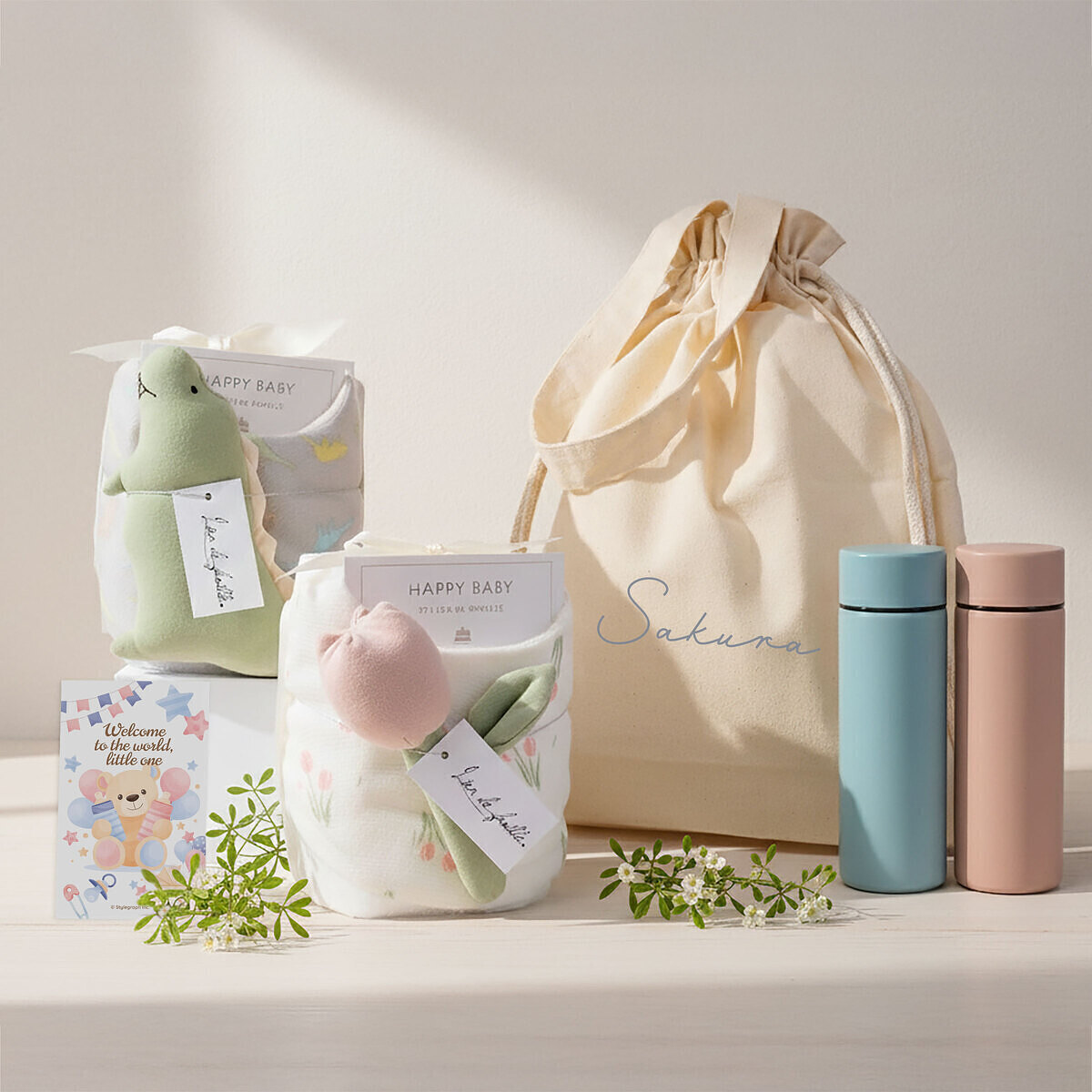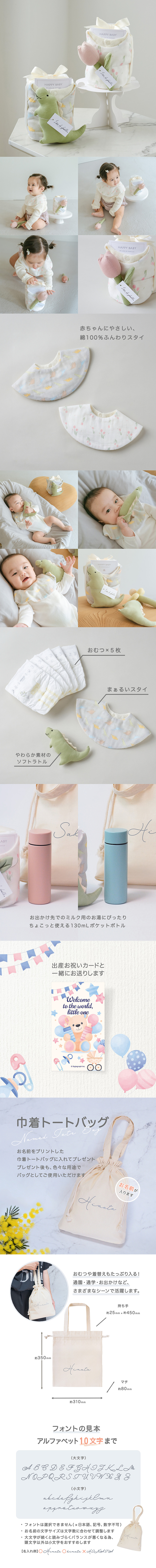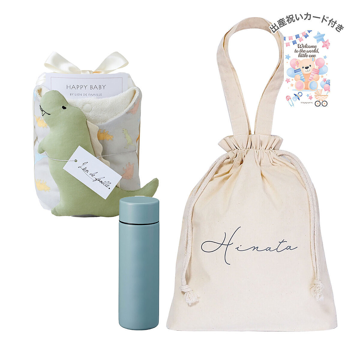 名前をお入れしたオリジナル巾着トートバッグでラッピングをしておお届けします。 出産祝いのギフトにおすすめ、スタイとラトルで飾ったオムツケーキと、ミルク用のお湯にもピッタリなミニボトルを多用途に使える巾着バッグにお入れしました。 「出産おめでとう!」の気持ちが伝わるお祝いカードを添えてお届けします。カードは男女問わずお贈りいただけるスタイリッシュなオリジナルデザインです。 ありそうでなかったサイズ感のおむつケーキ。定番のまぁるいスタイは日常使いしやすい綿100%で、裏地はパイル素材なので吸水性もあります。ソフトラトルは赤ちゃんが持ちやすい大きさで、優しい音色の鈴が入っています。 ポケットに収まるほど小さなサーモボトル。お出かけ先に持ち歩きたい、少量のミルクのお湯にもぴったりの容量 130 mL です。外出先の水分補給に、コップ一杯分のお茶やお水が手元にあると安心です。 お名前入り巾着トートバッグは、プレゼントしたあともオムツケースやお着替え入れにお使いいただけます。