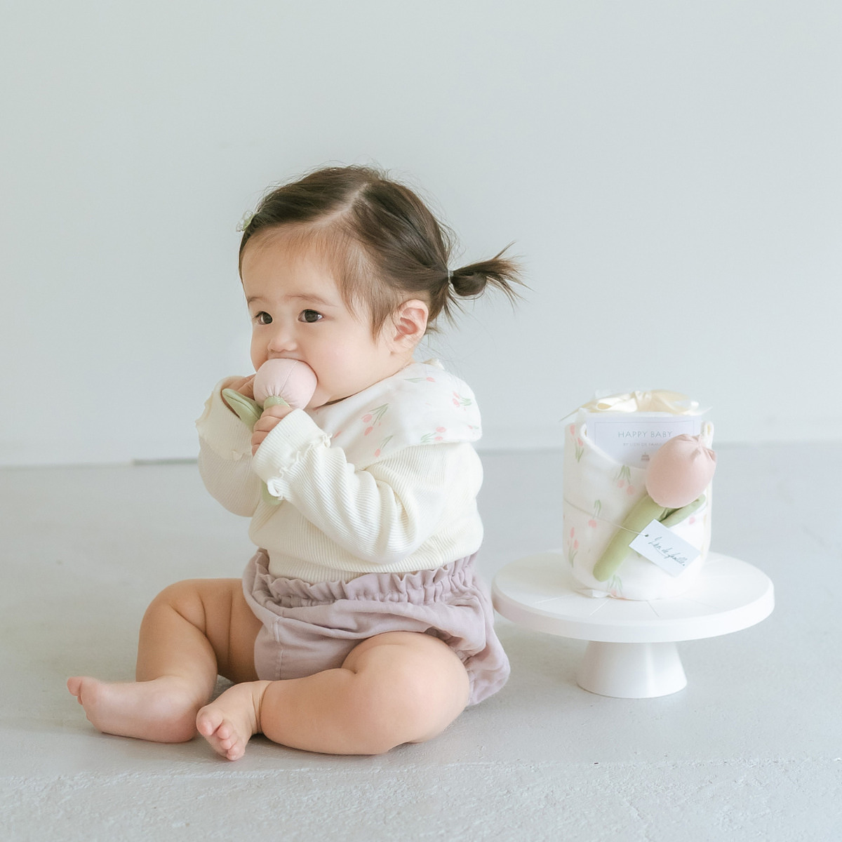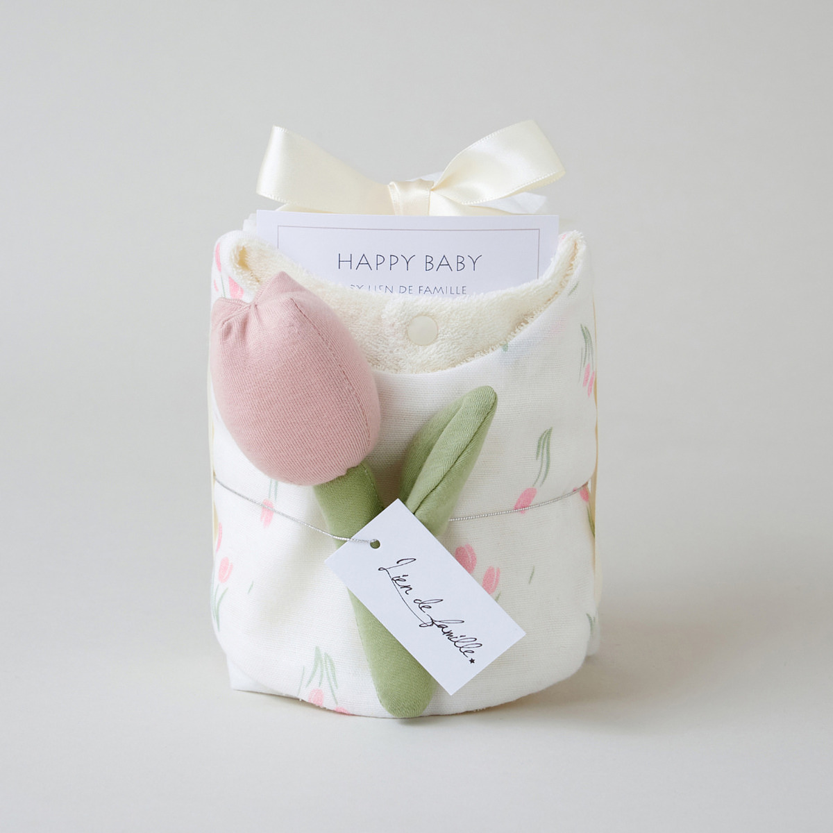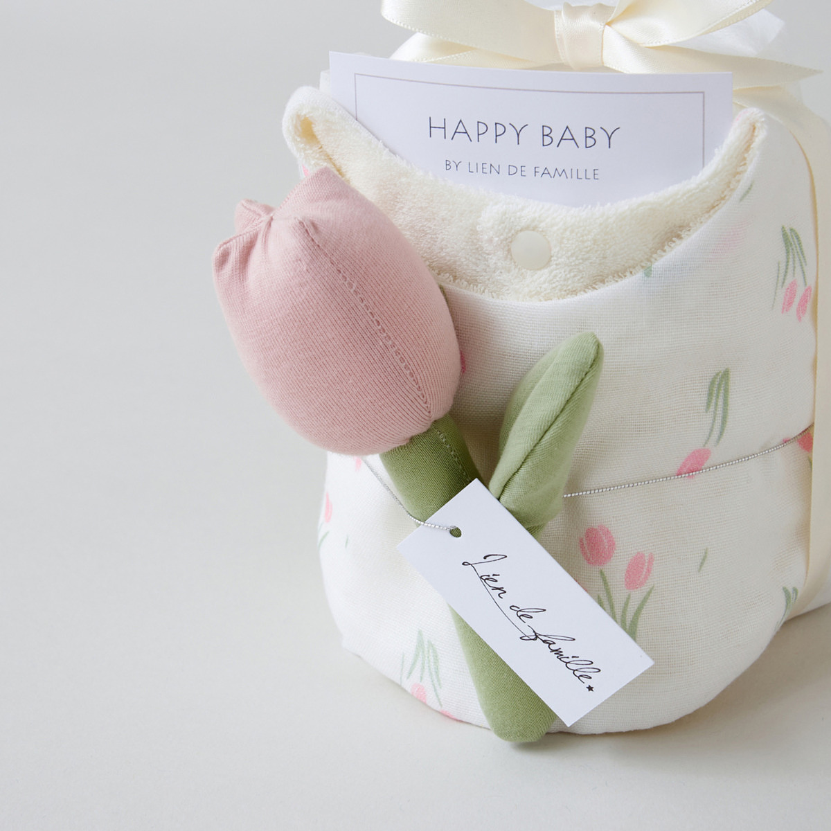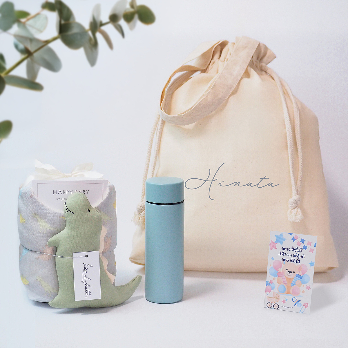 名前をお入れしたオリジナル巾着トートバッグでラッピングをしておお届けします。 出産祝いのギフトにおすすめ、スタイとラトルで飾ったオムツケーキと、ミルク用のお湯にもピッタリなミニボトルを多用途に使える巾着バッグにお入れしました。 「出産おめでとう!」の気持ちが伝わるお祝いカードを添えてお届けします。カードは男女問わずお贈りいただけるスタイリッシュなオリジナルデザインです。 ありそうでなかったサイズ感のおむつケーキ。定番のまぁるいスタイは日常使いしやすい綿100%で、裏地はパイル素材なので吸水性もあります。ソフトラトルは赤ちゃんが持ちやすい大きさで、優しい音色の鈴が入っています。 ポケットに収まるほど小さなサーモボトル。お出かけ先に持ち歩きたい、少量のミルクのお湯にもぴったりの容量 130 mL です。外出先の水分補給に、コップ一杯分のお茶やお水が手元にあると安心です。 お名前入り巾着トートバッグは、プレゼントしたあともオムツケースやお着替え入れにお使いいただけます。