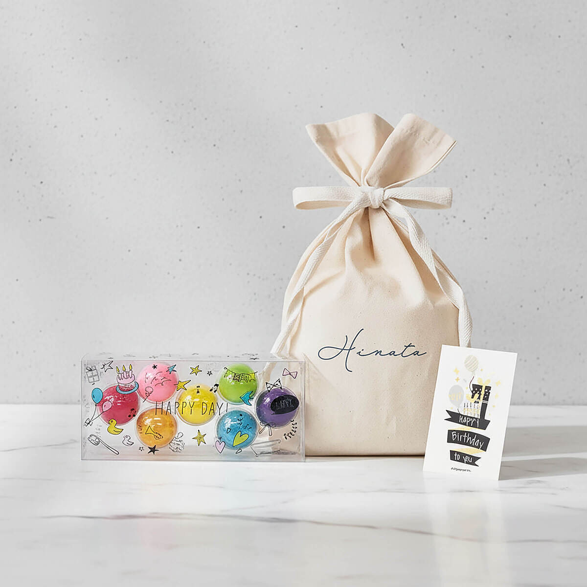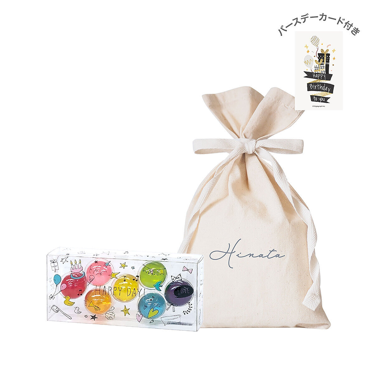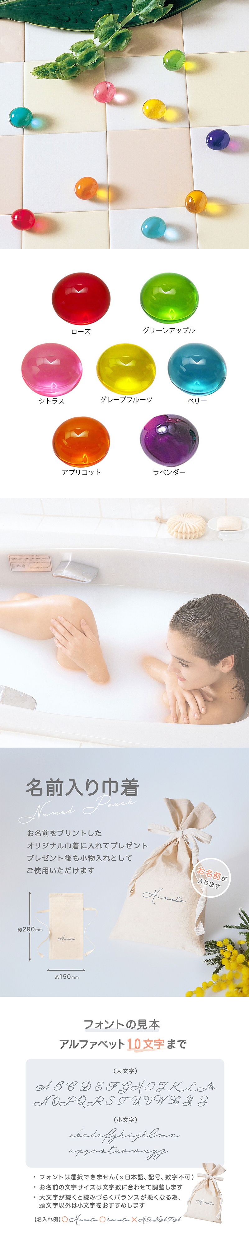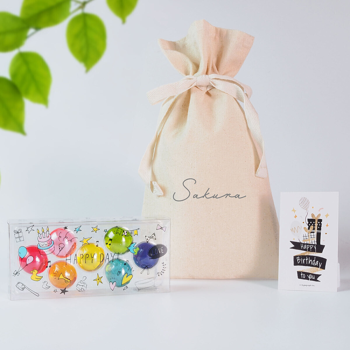 名前をお入れしたオリジナル巾着でラッピングをしてお届けします。 植物の葉や花、果実などから抽出されるエキスや植物油をとりいれた入浴料です。お風呂に入れると、カプセルが溶けて乳白色のお湯になり、フレッシュな香りが広がります。 巾着は小物入れとしてもお使いいただけます。130mlのボトルが入るサイズ感で、リップなどの化粧品や小物を入れて持ち運ぶのに便利です。 「誕生日おめでとう!」の気持ちが伝わるバースデーカードを添えてお届けします。裏面は無地なので、お手元で一言書き足すこともできます。