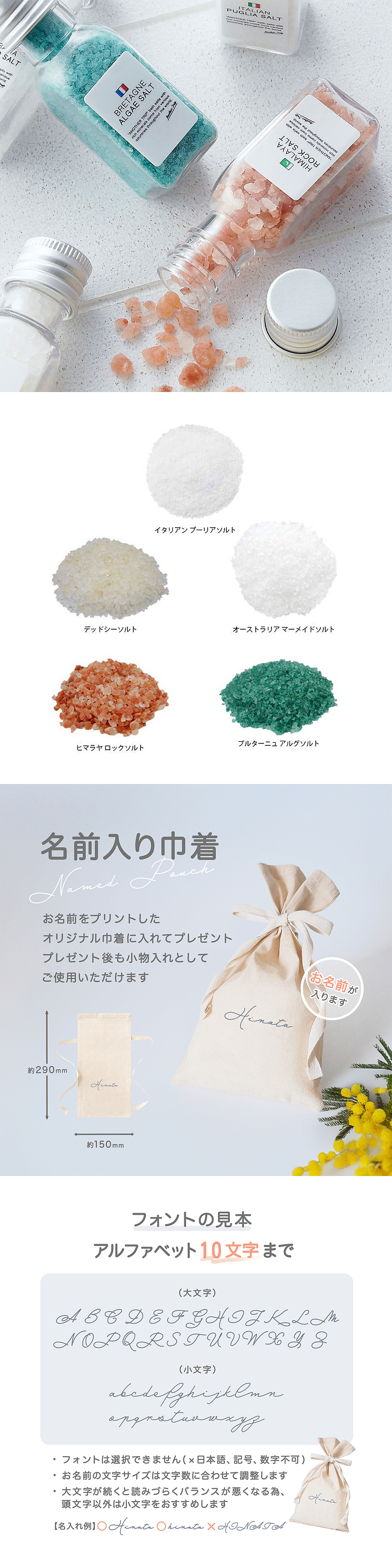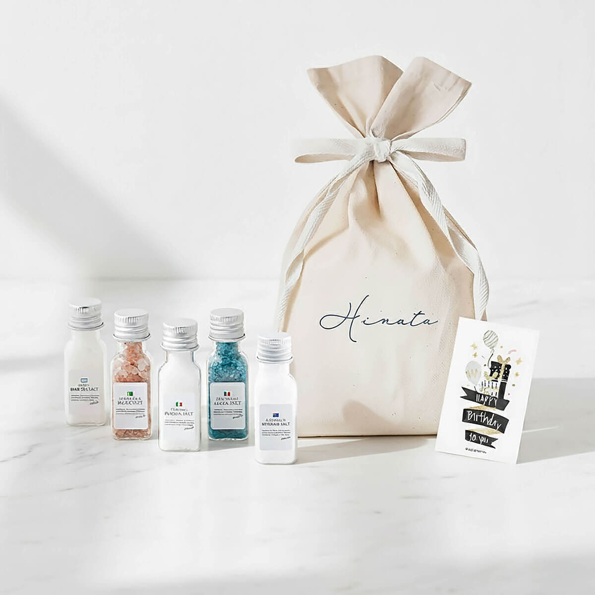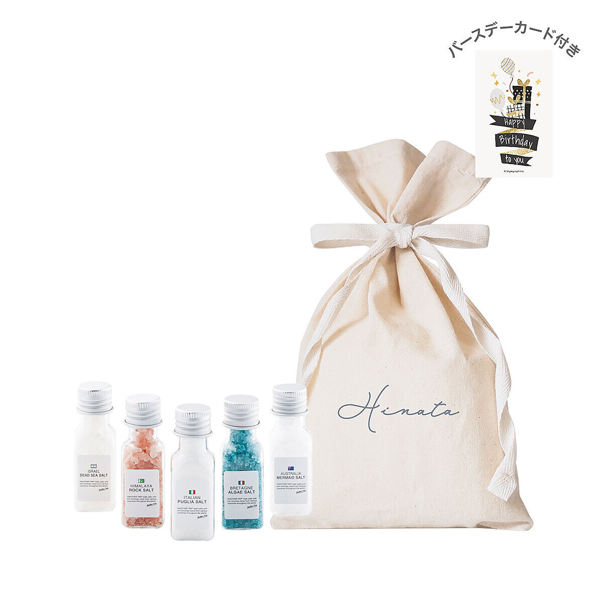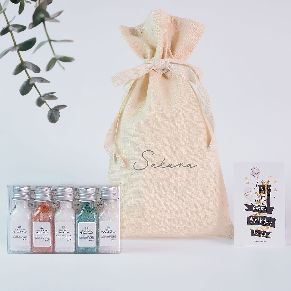 名前をお入れしたオリジナル巾着でラッピングをしてお届けします。 世界の国から集めた大自然の恵みいっぱいのバスソルトを、小さなボトルに詰め込んでセットしました。 巾着は小物入れとしてもお使いいただけます。130mlのボトルが入るサイズ感で、リップなどの化粧品や小物を入れて持ち運ぶのに便利です。 「誕生日おめでとう!」の気持ちが伝わるバースデーカードを添えてお届けします。裏面は無地なので、お手元で一言書き足すこともできます。
