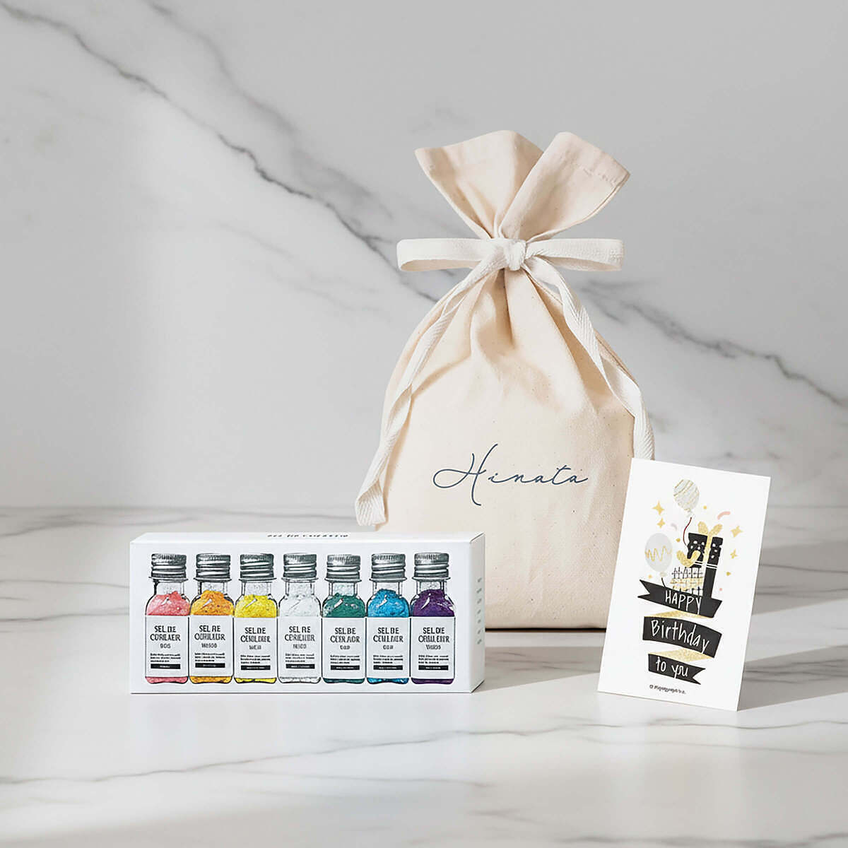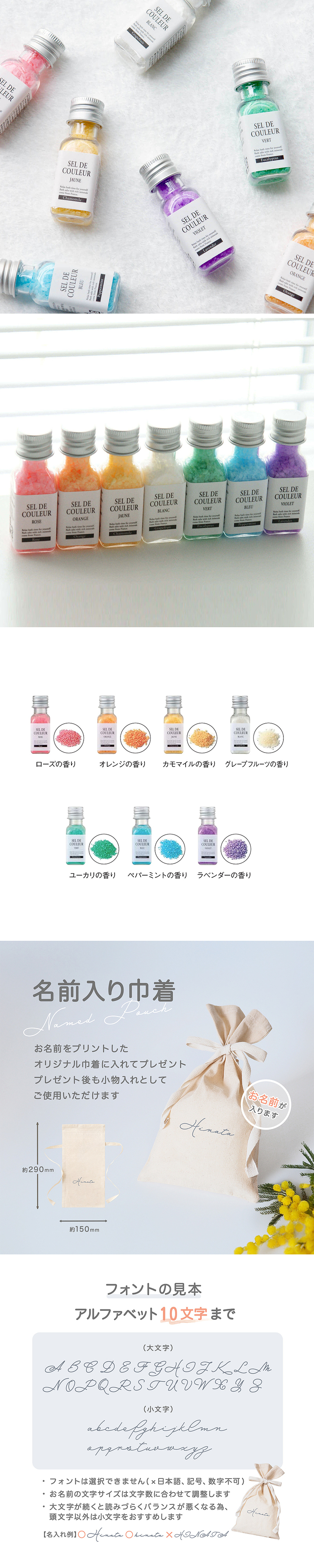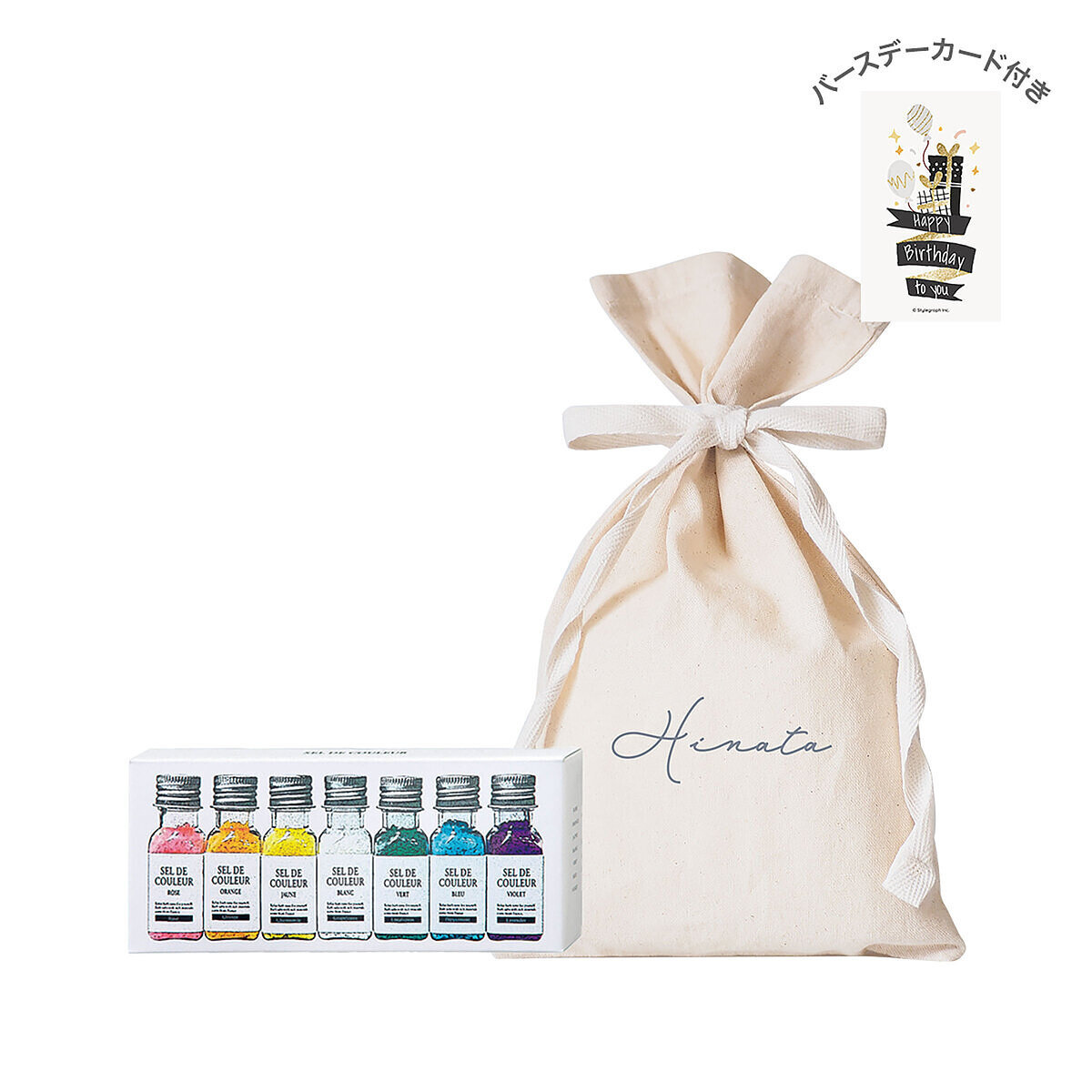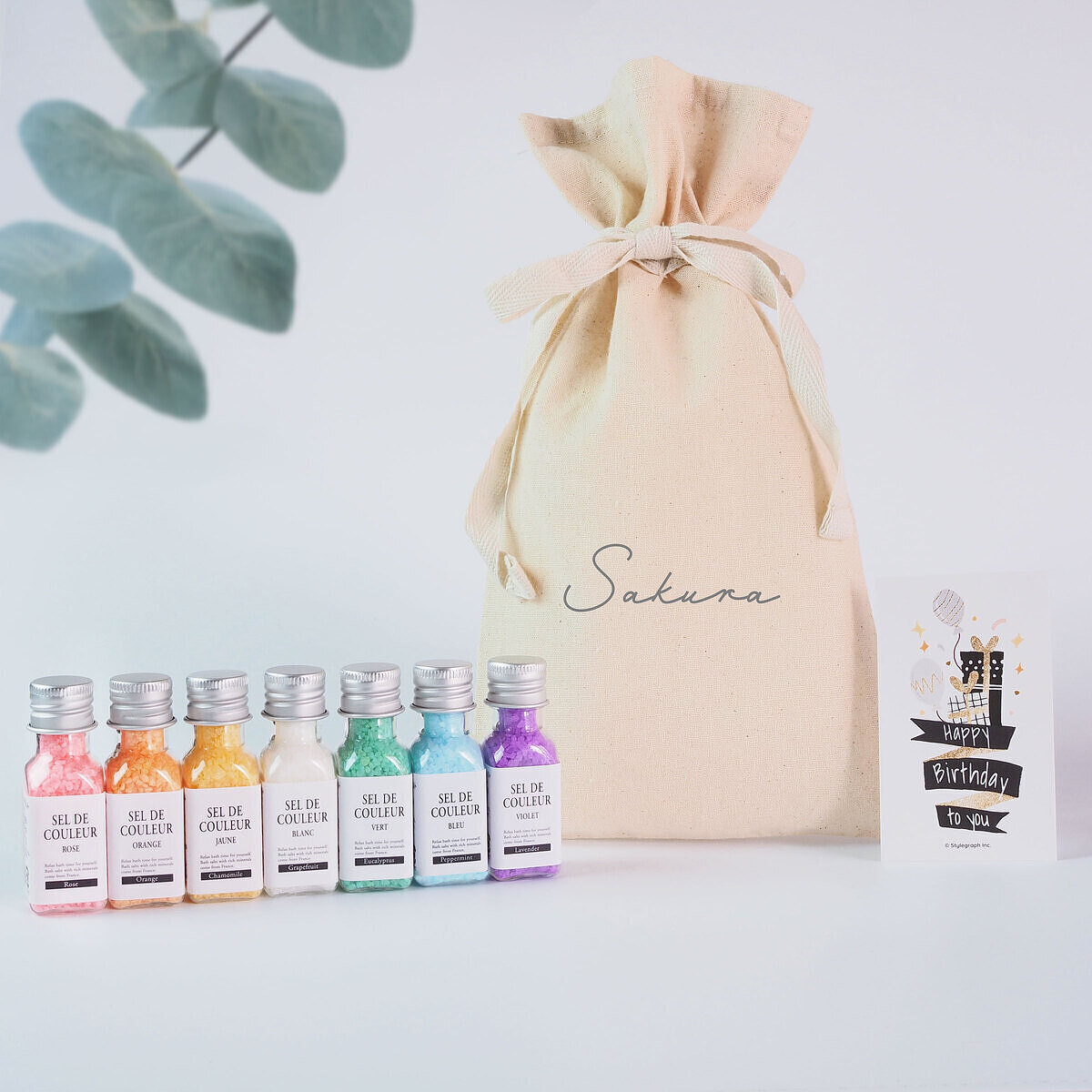 名前をお入れしたオリジナル巾着でラッピングをしてお届けします。 フランス産の自然塩に植物エキス (潤い成分) を配合したカラフルなバスソルトです。優しい香りと色とりどりの入浴剤が、疲れたカラダとココロを満たしてくれます。ちっちゃな7つのボトルは並べて置いてもオシャレ! 巾着は小物入れとしてもお使いいただけます。130mlのボトルが入るサイズ感で、リップなどの化粧品や小物を入れて持ち運ぶのに便利です。 「誕生日おめでとう!」の気持ちが伝わるバースデーカードを添えてお届けします。裏面は無地なので、お手元で一言書き足すこともできます。
