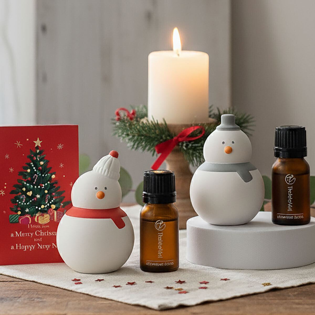 素焼きで出来たころんと可愛い雪だるまはクリスマスの飾りにも◎ セットのアロマオイルは華やかで甘い香りのゼラニウムやパルマローザ、爽やかな柑橘系のベルガモット、グレープフルーツなどに、ストレス軽減やイライラ・不安な気持ちを和らげるといわれるイランイランやクラリセージなどのブレンド。華やかで、元気が出る香りです。