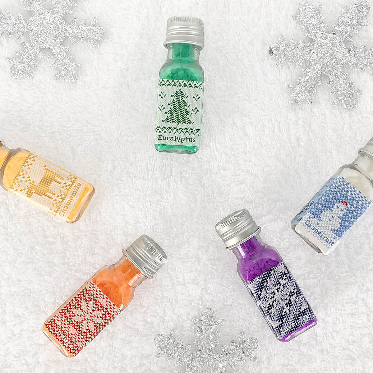 5種類の香りが楽しめるミニボトル入りのカラフルなバスソルトです。乾燥が気になる寒い冬にピッタリ、フランス産の自然塩に植物エキス (潤い成分) を配合されています。優しい香りと色とりどりの湯色でリラックスバスタイム♪