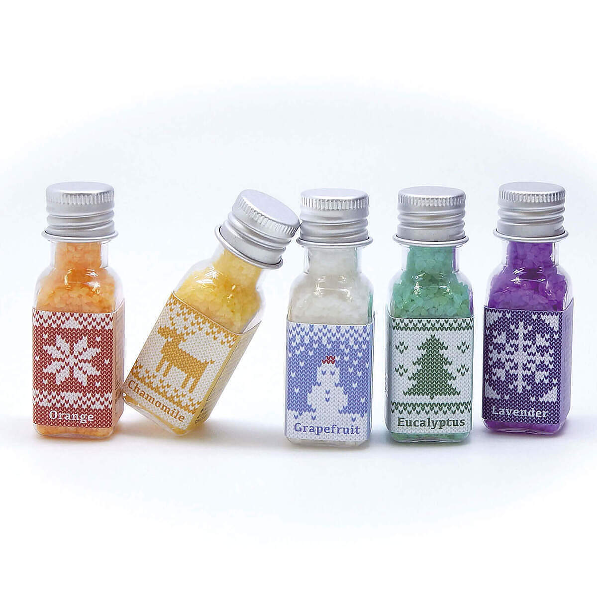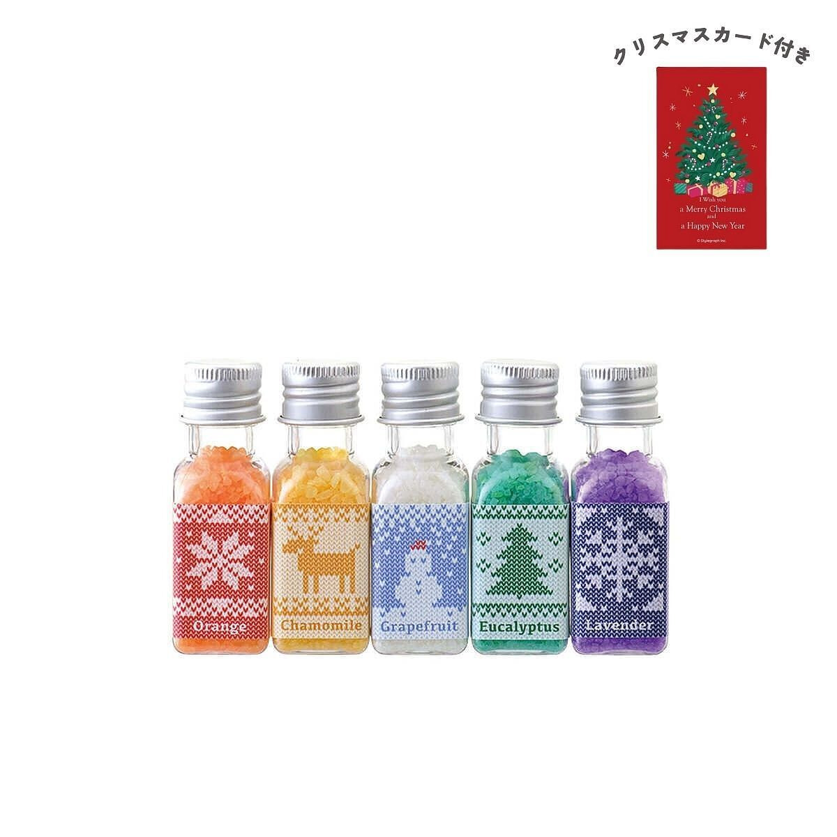 商品 : バスソルト オレンジの香り 25g, バスソルト カモマイルの香り 25g, バスソルト グレープフルーツの香り 25g, バスソルト ユーカリの香り 25g, バスソルト ラベンダーの香り 25g ボックス : 約 119 x 71 x 26 mm MADE IN JAPAN