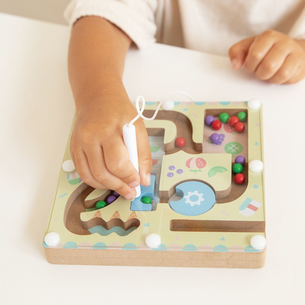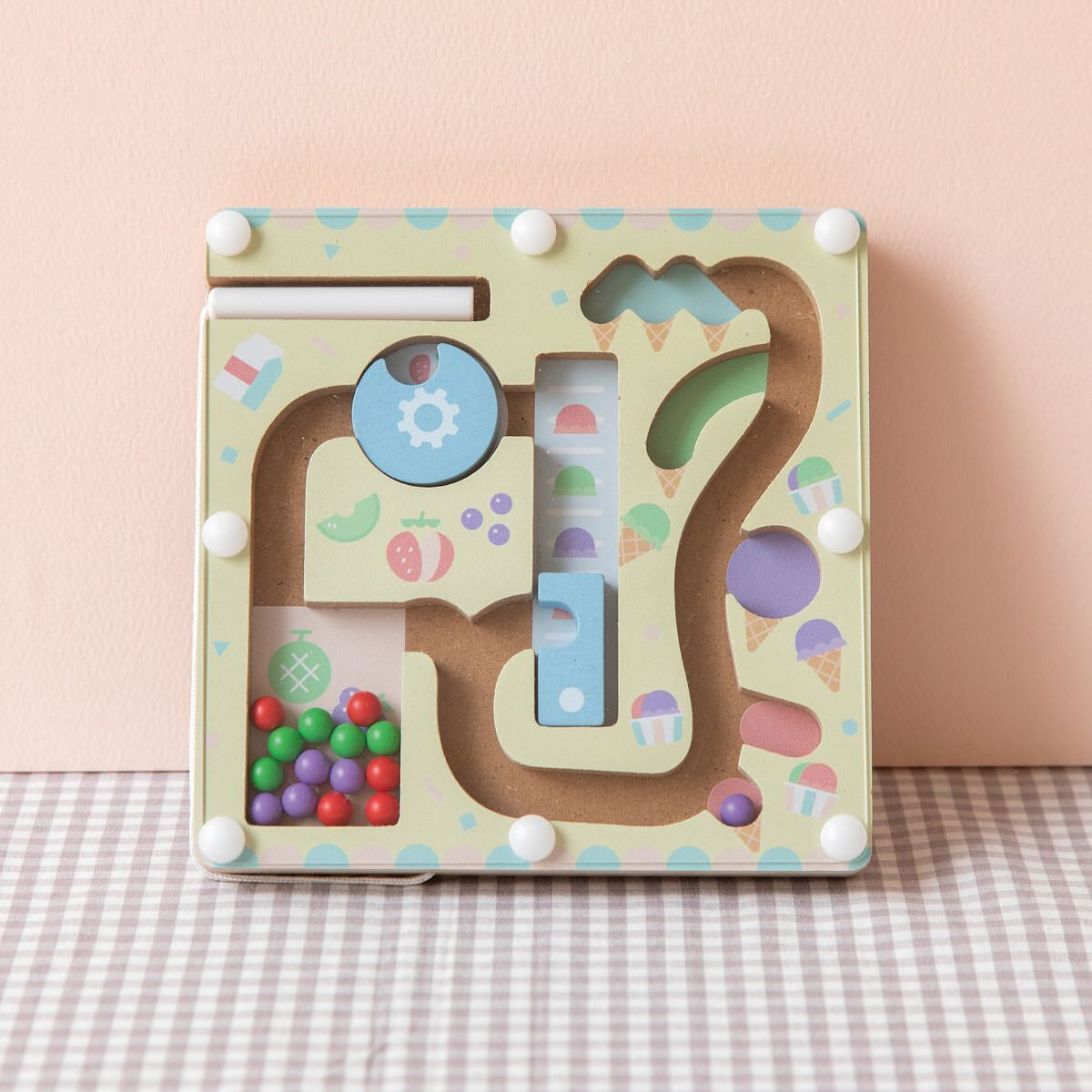 ひんやり冷たいアイスクリームラボの中を探検!マグネットペンで材料を運んでアイスを作る、しかけいっぱいの迷路あそびのおもちゃです。 食後や寝る前、移動中などお出かけ先でもサッと遊べる知育玩具。持ち運びしやすい手軽さで、しっかりと知育効果を感じられるので、親子時間やギフトにおすすめです。